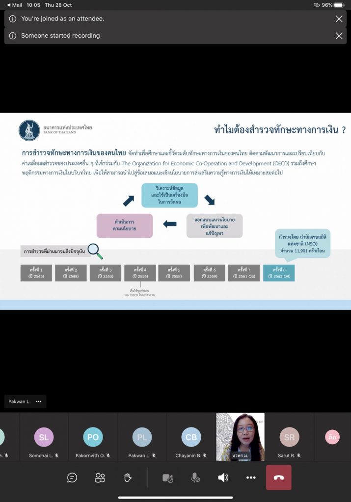 ส่วนผลสำรวจความรู้ทางการเงินของคนไทย มีการปรับตัวดีขึ้นจากปี 2561 ในทุกหัวข้อ โดยจุดอ่อนของคนไทยที่ได้คะแนนน้อยสุด 3 อันดับแรก คือ การคำนวณดอกเบี้ยเงินฝากทบต้น การกระจายความเสี่ยงในการลงทุนและมูลค่าเงินตามเวลา และหัวข้อที่ต่ำกว่าค่าเฉลี่ย OECD มากที่สุด คือ เรื่องนิยามเงินเฟ้อ รองลงมาเป็นหัวข้อความเสี่ยงและผลตอบแทน และการคำนวณดอกเบี้ยสินเชื่อ