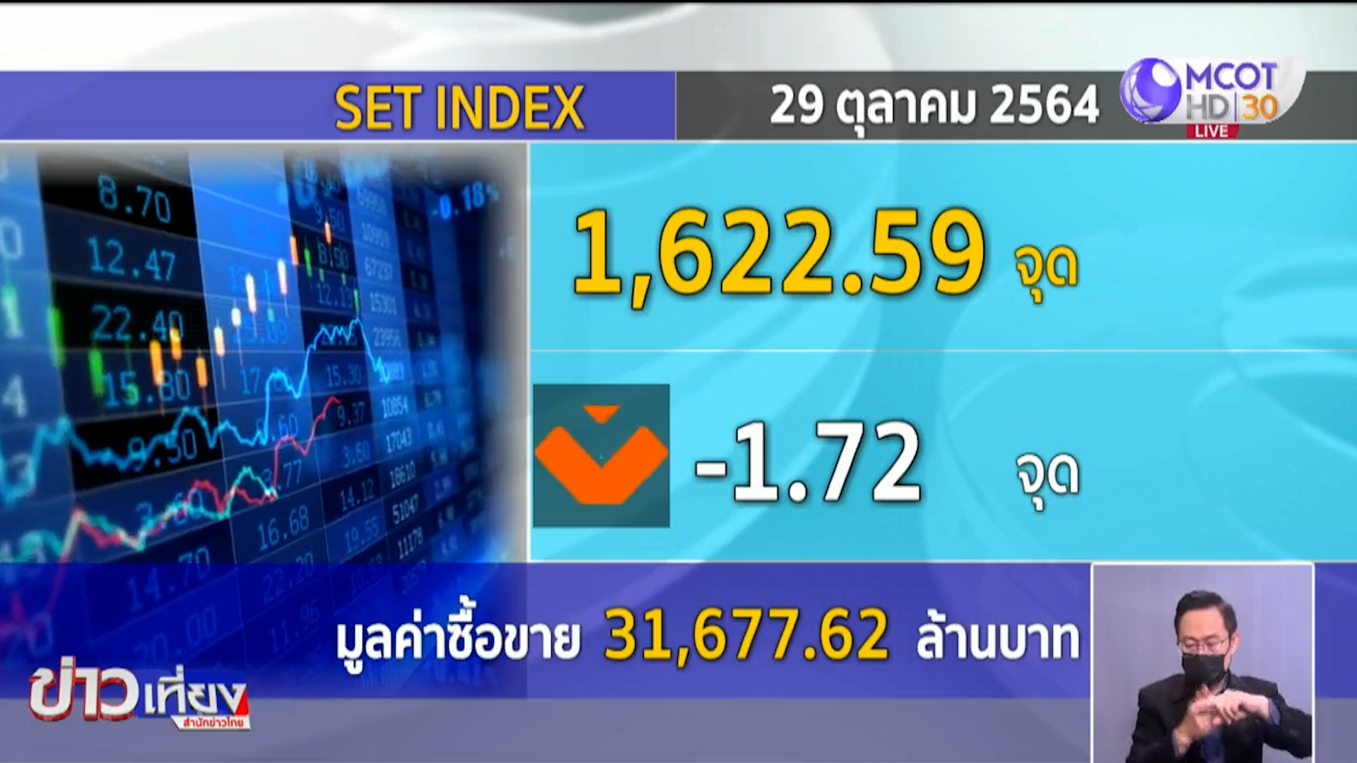 กทม. 29 ต.ค.- ความเคลื่อนไหวตลาดหุ้นไทยช่วงเช้าวันนี้ เปิดตลาดปรับตัวขึ้นมาเล็กน้อย ขณะที่ช่วงเที่ยงดัชนีอยู่ที่ 1,622.59 จุด -1.72 จุด มูลค่าการซื้อขาย 31,677.62 ล้านบาท