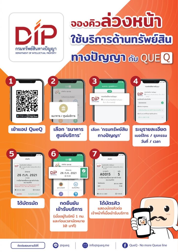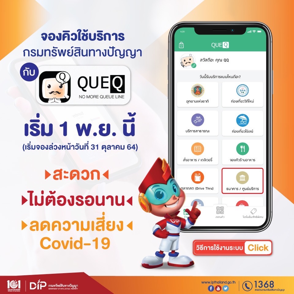 อย่างไรก็ตาม การจองคิวออนไลน์ เพื่อเข้าใช้บริการด้านทรัพย์สินทางปัญญา สามารถทำได้ง่ายๆ เพียงผู้ติดต่อดาวน์โหลดแอปพลิเคชั่น QueQ ลงในสมาร์ทโฟน เพื่อจองคิวล่วงหน้าอย่างน้อย 1 วัน ก่อนมารับบริการที่ศูนย์บริการประชาชน ชั้น 3 กรมทรัพย์สินทางปัญญา สำหรับผู้ที่มีข้อสงสัยเกี่ยวกับการจองคิวออนไลน์ล่วงหน้าสามารถติดต่อสอบถามข้อมูลเพิ่มเติมได้ที่สายด่วนกรมทรัพย์สินทางปัญญา โทร 1368” ได้.-สำนักข่าวไทย