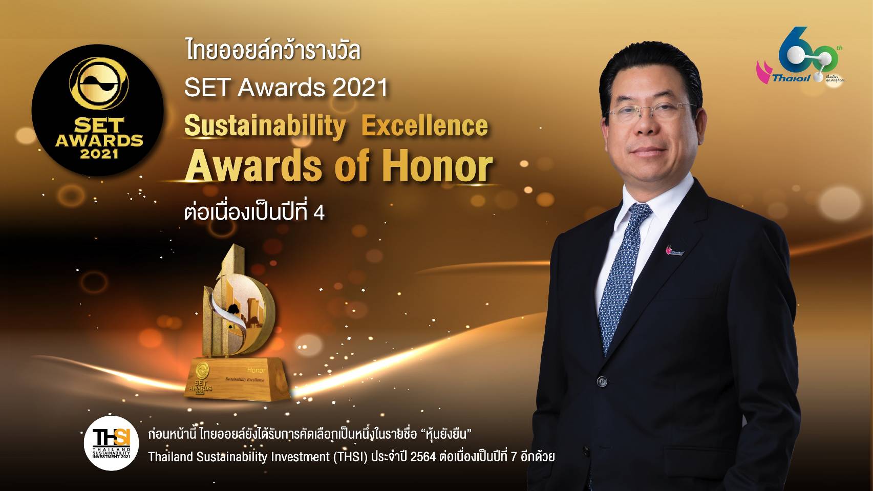 บริษัท ไทยออยล์ จำกัด (มหาชน) แจ้งว่าได้รับ รางวัล SET Awards 2021 กลุ่มรางวัล Sustainability Excellence ประเภทรางวัลเกียรติยศแห่งความสำเร็จ (Sustainability Awards of Honor) ต่อ ในพิธีมอบรางวัล SET Awards 2021 จัดโดยตลาดหลักทรัพย์แห่งประเทศไทยและวารสารการเงินธนาคาร