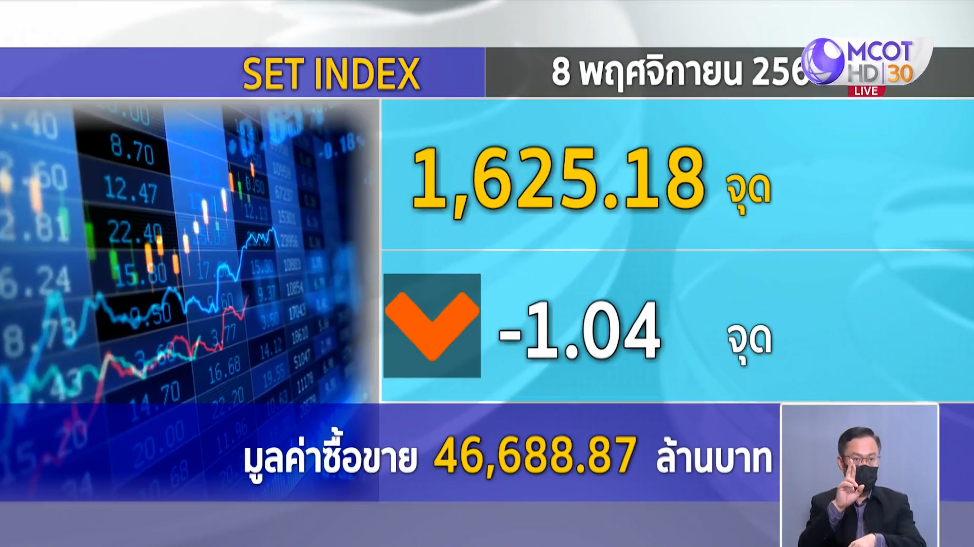 กทม. 8 พ.ย.-ตลาดหุ้นไทยภาคเช้า ดีดตัวเป็นบวก แต่ล่าสุดดัชนีเคลื่อนไหวอยู่ที่ 1,625.18 จุด -1.04 จุด มูลค่าการซื้อขาย 46,688.87 ล้านบาท
