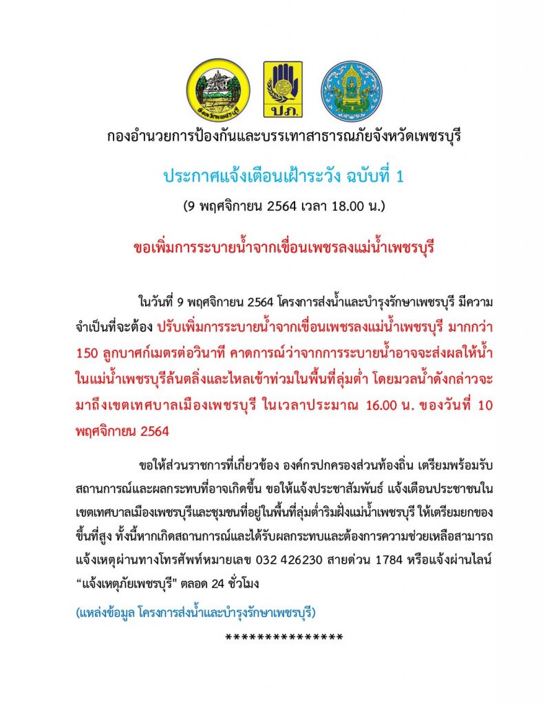 ล่าสุดกองอำนวยการป้องกันและบรรเทาสาธารณภัยจังหวัดออกประกาศแจ้งเตือนฉบับที่ 1 เย็นวานนี้ (9 พ.ย.) ให้ประชาชนในเขตเทศบาลเมืองเพชรบุรีและชุมชนที่อยู่ในพื้นที่ลุ่มต่ำริมฝั่งแม่น้ำเพชรบุรียกของขึ้นที่สูง และหากต้องการความช่วยเหลือสามารถแจ้งเหตุผ่านทางโทรศัพท์หมายเลข 032 426230 สายด่วน 1784.- สำนักข่าวไทย
