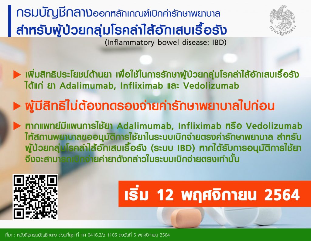 กรุงเทพฯ 10 พ.ย.-กรมบัญชีกลาง เพิ่มสิทธิผู้ป่วยกลุ่มโรคลำไส้อักเสบเรื้อรัง เบิกค่ารักษาพยาบาล เริ่ม 12 พ.ย.64