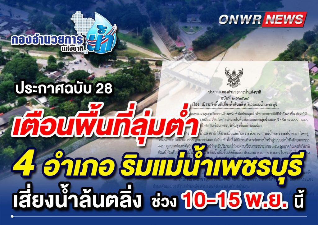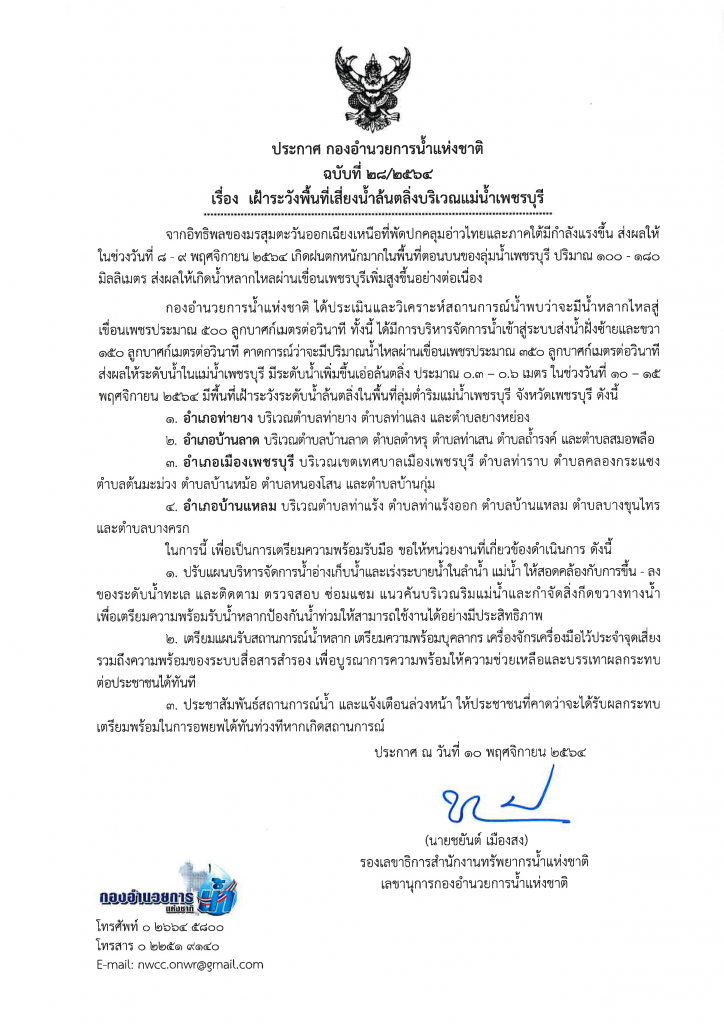 นายชยันต์ เมืองสง รองเลขาธิการสำนักงานทรัพยากรน้ำแห่งชาติ (สทนช.) และเลขานุการกองอำนวยการน้ำแห่งชาติ (กอนช.) กล่าวว่า ได้ลงนามในประกาศ กอนช. เรื่อง เฝ้าระวังน้ำแม่น้ำเพชรบุรีล้นตลิ่ง เนื่องจากในช่วงวันที่ 8 – 9 พ.ย. เกิดฝนตกหนักมากในพื้นที่ตอนบนของลุ่มน้ำเพชรบุรี 100 – 180 มิลลิเมตร ส่งผลให้เกิดน้ำหลากไหลผ่านเขื่อนเพชรเพิ่มสูงขึ้นอย่างต่อเนื่อง คาดว่าจะมีปริมาณน้ำที่ไหลผ่านเขื่อนเพชรมากถึง 500 ลูกบาศก์เมตรต่อวินาที