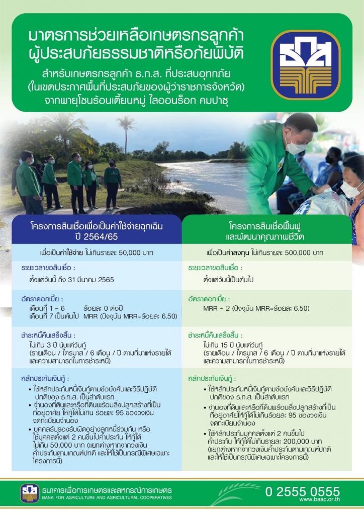 นอกจากนี้ ยังได้มอบหมายให้พนักงาน ธ.ก.ส. ในพื้นที่ออกเยี่ยมเยียนให้กำลังใจ พร้อมจัดหาถุงยังชีพไปมอบให้เกษตรกรลูกค้าและประชาชนที่เดือดร้อน รวมถึงเข้าไปสนับสนุนศูนย์อพยพหรือจุดรวมพลต่าง ๆ ร่วมกับหน่วยงานในท้องถิ่น ไม่ว่าจะเป็น การจัดหาอาหาร น้ำดื่ม บริการสุขาเคลื่อนที่ เต็นท์สนาม และความช่วยเหลือด้านอื่น ๆ อีกทั้ง ธ.ก.ส. ได้พิจารณาขยายระยะเวลาชำระคืนต้นเงินกู้และดอกเบี้ยออกไปสูงสุดไม่เกิน 12 เดือน ตามศักยภาพของลูกหนี้โดยไม่คิดดอกเบี้ยปรับ เพื่อบรรเทาความเดือดร้อนตามความหนักเบาของเกษตรกรผู้ประสบภัย เกษตรกรผู้ประสบความเดือดร้อนสามารถติดต่อ ธ.ก.ส. ในพื้นที่เพื่อขอรับการช่วยเหลือในด้านต่าง ๆ ได้ทันที หรือสอบถามที่ Call Center 02 555 0555 .- สำนักข่าวไทย