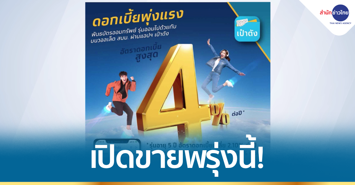 กรุงเทพฯ 14 พ.ย.- เริ่มพรุ่งนี้! พันธบัตรออมทรัพย์วอลเล็ต สบม.รุ่น ออมไปด้วยกัน จำนวน 2 รุ่น คือ รุ่นอายุ 5 ปี ดอกเบี้ยสูงสุด 3% ต่อปี และอายุ 10 ปี ดอกเบี้ยสูงสุด 4% ต่อปี จ่ายดอกเบี้ยทุก 3 เดือน