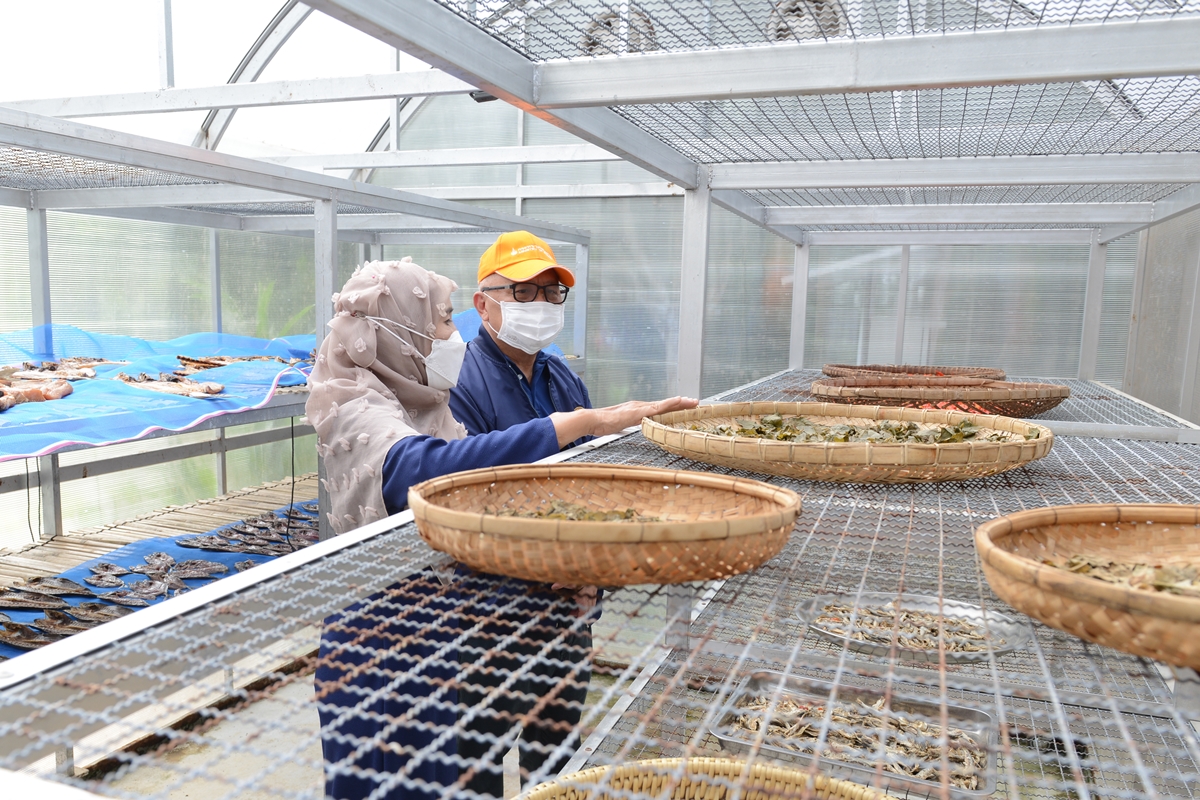 ส่วนอีกโครงการ คือ โครงการเพิ่มสมรรถนะการบริหารจัดการและจัดการพลังงานชุมชนครบวงจรในวิสาหกิจชุมชนกลุ่มแปรรูปผลิตภัณฑ์บ้านไหนหนัง ตำบลเขาคราม อำเภอเมือง จังหวัดกระบี่ ซึ่งถือเป็นตัวอย่างความสำเร็จที่เป็นรูปธรรม จากงบแผ่นดินปี 2562 วงเงินประมาณ 100,000 บาท จากการใช้เทคโนโลยี โรงอบแห้งพลังงานแสงอาทิตย์ ในการแปรรูปผลิตภัณฑ์ อาทิ ปลาแดดเดียว กะปิ ปลาเค็ม และชาใบขลู่ สามารถลดระยะเวลาในการแปรรูปผลิตภัณฑ์ และสร้างมูลค่าเพิ่มให้ผลิตภัณฑ์สามารถออกสู่ตลาดได้ในวงกว้าง เช่น ปลาทูสด จากเดิมจำหน่ายได้เพียงกิโลกรัมละ 20 บาท แต่หลังจากนำมาแปรรูปเป็นปลาแดดเดียว สามารถจำหน่ายได้ในราคา 130-150 บาท/กิโลกรัม ปัจจุบันทางกลุ่มมีรายได้จากการแปรรูปผลิตภัณฑ์จากโรงอบแห้งพลังงานแสงอาทิตย์นี้ เฉลี่ยอยู่ที่ 12,000-13,000 บาท/เดือน