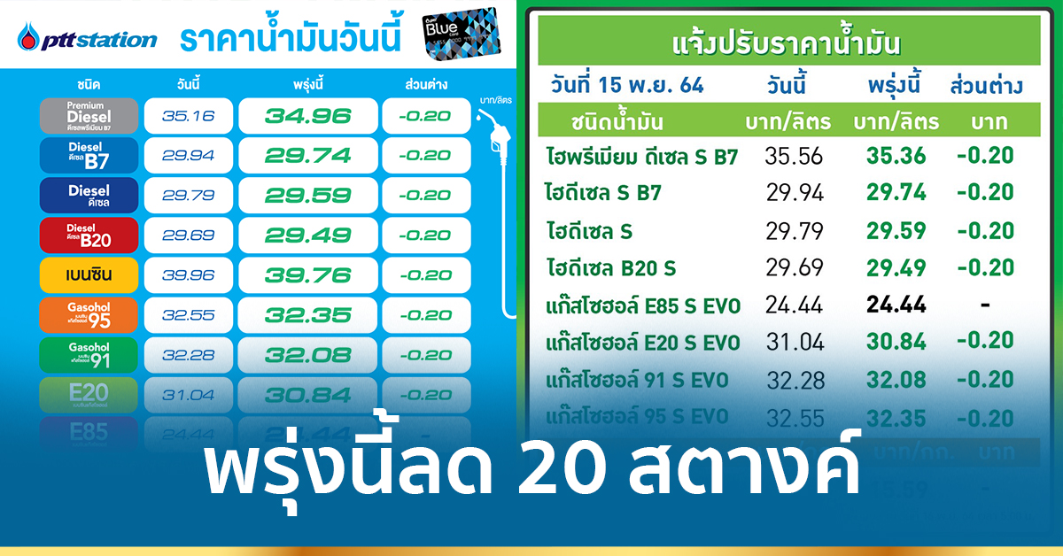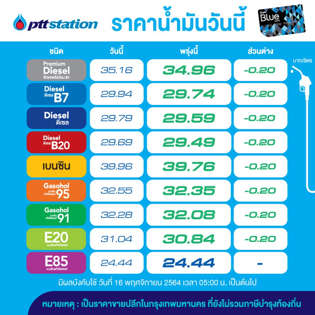 PTT Station ปรับลดราคาขายปลีกน้ำมันทุกชนิดลง 0.20 บาทต่อลิตร เว้น E85 คงเดิม มีผล 16 พ.ย.64 เวลา 05.00 น. เป็นต้นไป โดยราคาขายปลีกจะเป็นดังนี้