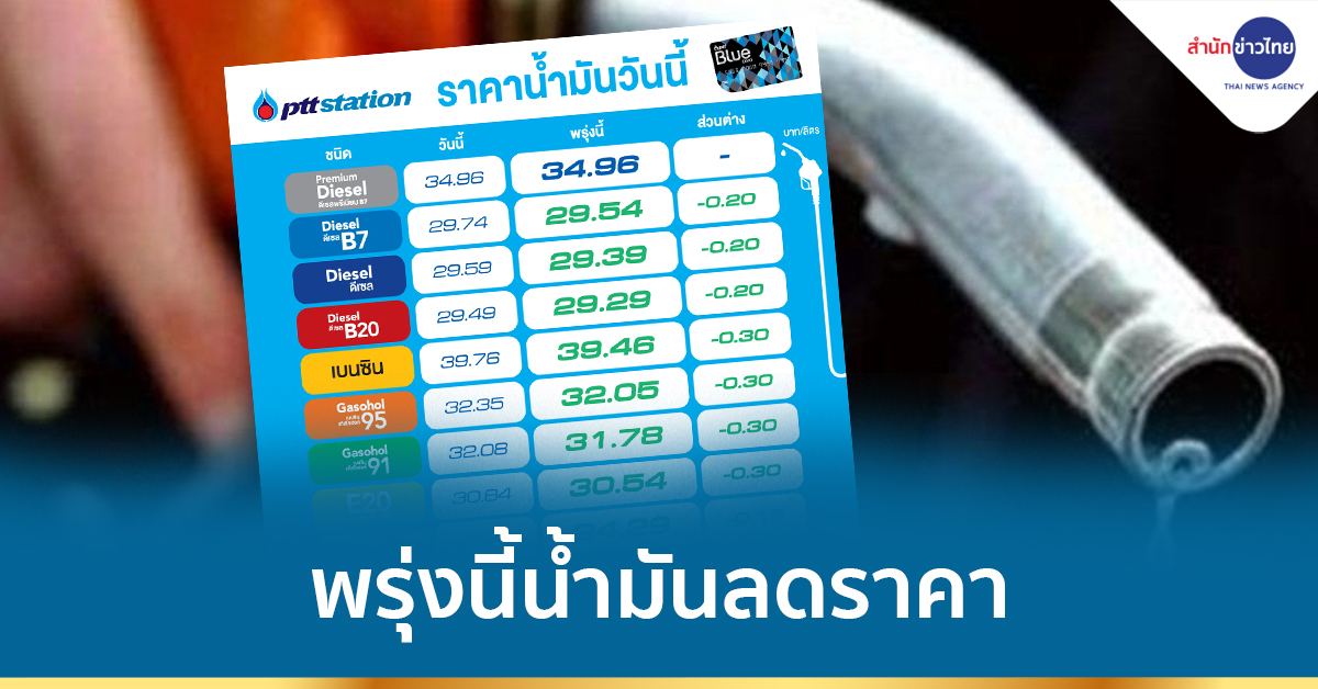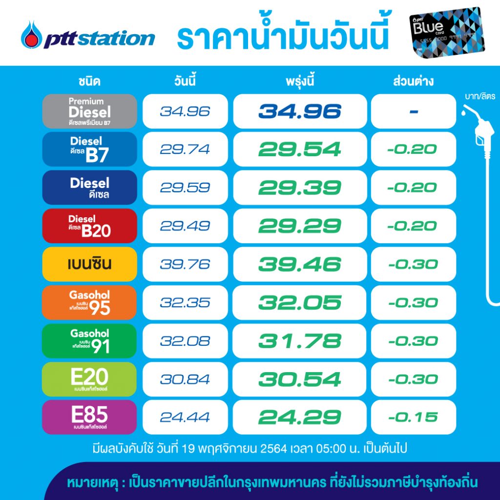 PTT Station ปรับลดราคาขายปลีกน้ำมันกลุ่มเบนซินและแก๊สโซฮอล์ ทุกชนิดลง 0.30 บาทต่อลิตร เว้น E85 ลดลง 0.15 บาทต่อลิตร ส่วนกลุ่มดีเซลทุกชนิด ลดลง 0.20 บาทต่อลิตร เว้นดีเซลพรีเมี่ยม B7 คงเดิม มีผล 19 พ.ย.64 เวลา 05.00 น. เป็นต้นไป