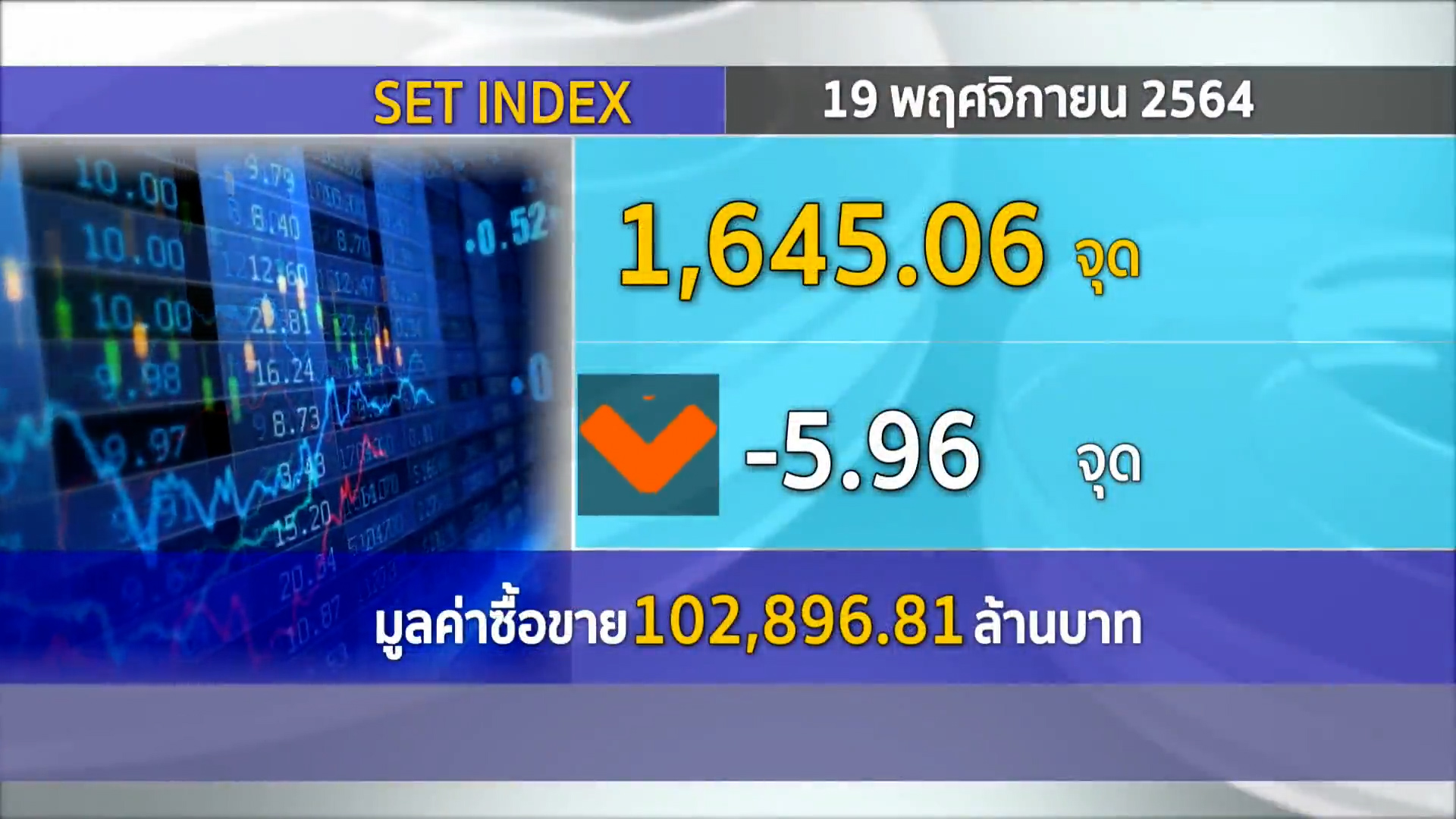 กทม. 19 พ.ย.-ตลาดหลักทรัพย์ ปิดวันนี้ที่ระดับ 1,645.06 จุด ลดลง 5.96 จุด (-0.36%) มูลค่าการซื้อขาย 102,896.81 ล้านบาท ไม่ผ่านด่าน 1,650 ขายกลุ่มแบงก์กดดัน/สัปดาห์หน้าแกว่งตัว