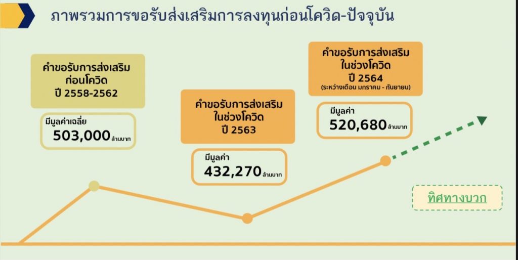 กรุงเทพฯ 22 พ.ย.-บีโอไอ ชี้ทิศทางการลงทุนตามนโยบายโมเดลเศรษฐกิจ BCG มาแรง เฉพาะปีนี้ มูลค่าการลงทุนสูงกว่าปีที่แล้ว 160 % ขณะที่สถิติการขอรับการส่งเสริมการลงทุนตั้งแต่ปี 2558 ถึง กันยายน 2564 รวมเกือบ 7 แสนล้านบาท