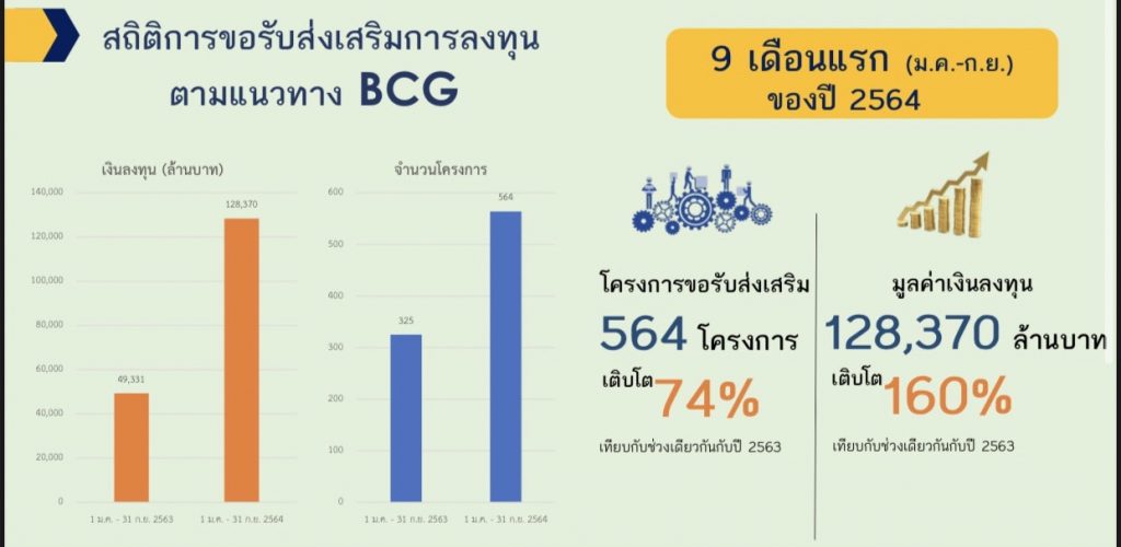 จากสถิติคำขอรับการส่งเสริมการลงทุนกิจการในกลุ่ม BCG ตั้งแต่ ปี 2558 – กันยายน 2564 มีจำนวน 2,829 โครงการ มูลค่าเงินลงทุนรวม 677,157 ล้านบาท โดย 5 อันดับแรกกิจการ BCG ที่มีมูลค่าการลงทุนสูงสุด คือ 1. กิจการผลิตพลังงานไฟฟ้า ที่เป็นพลังงานหมุนเวียน 289,007 ล้านบาท 2. กิจการผลิตหรือถนอมอาหาร เครื่องดื่ม วัตถุเจือปนอาหาร หรือสิ่งปรุงอาหาร โดยใช้เทคโนโลยีที่ทันสมัย 94,226 ล้านบาท 3. กิจการผลิตเคมีภัณฑ์หรือพอลิเมอร์ที่เป็นมิตรต่อสิ่งแวดล้อม 40,998 ล้านบาท 4. กิจการผลิตผลิตภัณฑ์จากผลพลอยได้หรือเศษวัสดุทางการเกษตร 25,838 ล้านบาท 5. กิจการผลิตผลิตภัณฑ์ จากยางธรรมชาติ 22,250 ล้านบาท โดยเฉพาะในช่วง 9 เดือนแรก ปี 2564 (ม.ค. – ก.ย.) มีสัญญาณบ่งชี้อัตราเติบโตที่ดี โดยมีกิจการขอรับการส่งเสริมการลงทุน 564 โครงการ จำนวนโครงการเพิ่มขึ้นเมื่อเทียบกับช่วงเดียวกันของปีก่อนร้อยละ 74 และมีมูลค่าลงทุน 128,370 ล้านบาท เพิ่มขึ้นสูงกว่าช่วงเดียวกันกับปีก่อนร้อยละ 160 และสูงกว่ามูลค่าการลงทุนในปี 2563 ทั้งปี (93,883 ล้านบาท)
