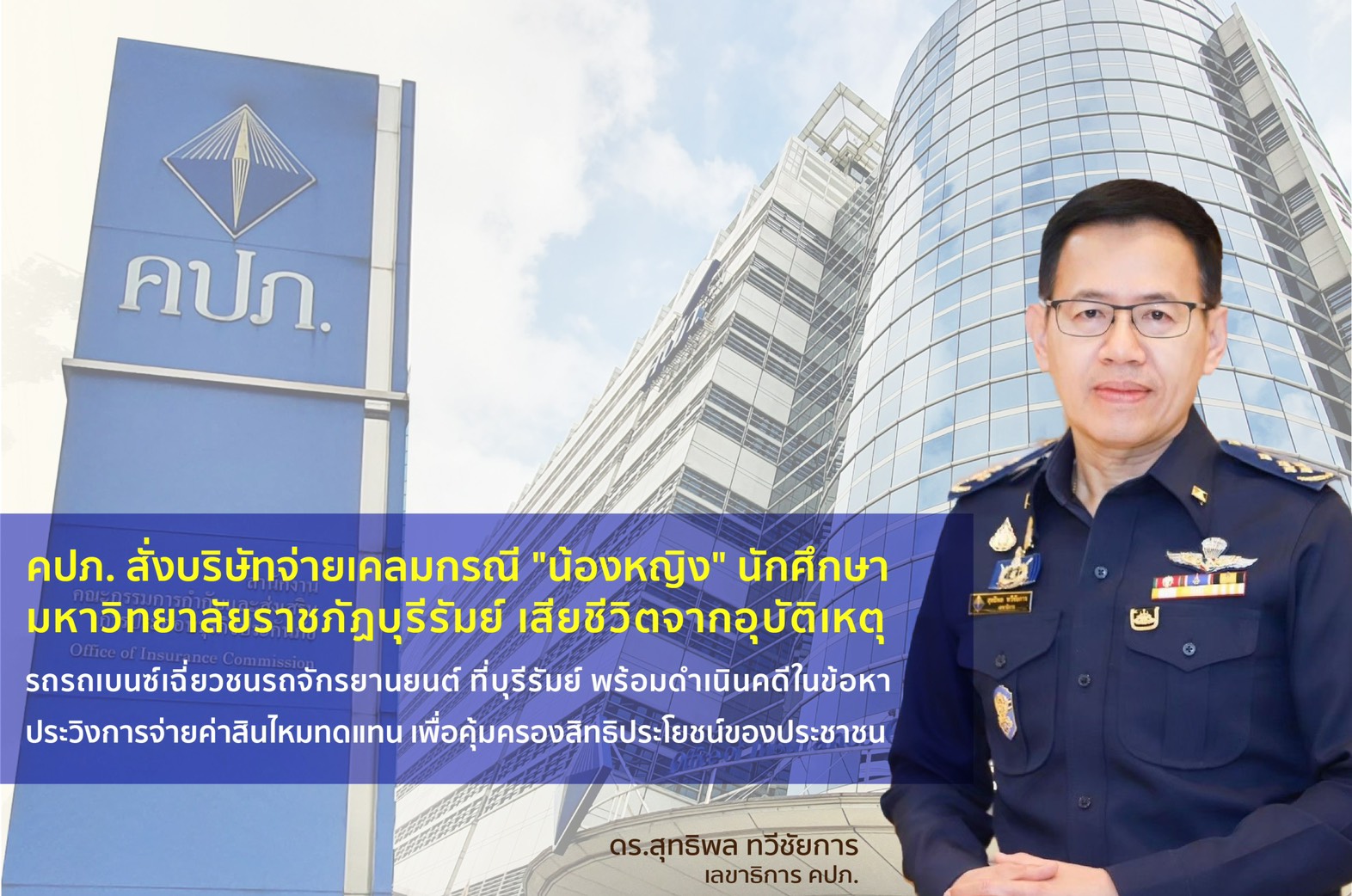 กรุงเทพฯ 23 พ.ย.- คปภ. สั่งบริษัทจ่ายเคลม “น้องหญิง” ราชภัฏบุรีรัมย์ เสียชีวิต รถรถเบนซ์เฉี่ยวชน เร่งคดี ประวิงการจ่ายค่าสินไหมทดแทน เพื่อคุ้มครองสิทธิผู้เอาประกัน