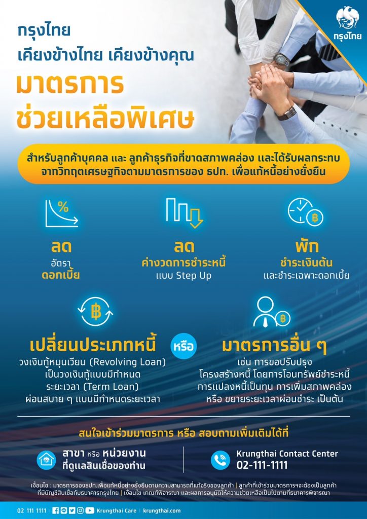 นายเอกชัย เตชะวิริยะกุล รองกรรมการผู้จัดการใหญ่ ธนาคารกรุงไทย กล่าวว่า ธนาคารกรุงไทย เล็งเห็นความจำเป็นเร่งด่วนเพื่อช่วยเหลือลูกค้าทุกกลุ่ม จึงได้ออกมาตรการพิเศษสำหรับลูกค้าธุรกิจและรายย่อย มีปัญหาขาดสภาพคล่อง ต้องการลดค่าใช้จ่าย และบริหารจัดการแก้หนี้อย่างมีระบบ ครอบคลุมทั้ง ลดอัตราดอกเบี้ย, ลดค่างวดการชำระหนี้แบบ Step Up พักชำระเงินต้นและชำระเฉพาะดอกเบี้ย เปลี่ยนประเภทหนี้ วงเงินกู้หมุนเวียน (Revolving Loan) เป็นวงเงินกู้แบบมีกำหนดระยะเวลา (Term Loan) ผ่อนสบายๆ แบบมีกำหนดระยะเวลา