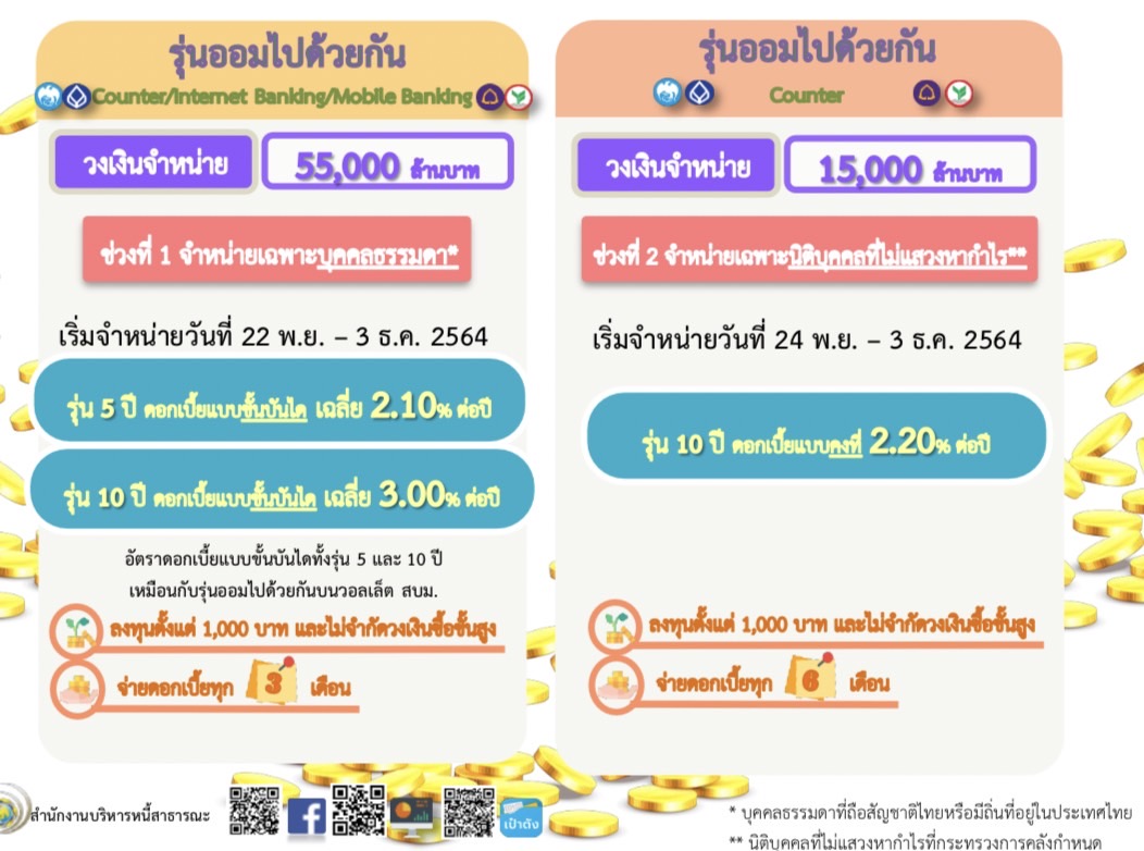 สบน. ขอขอบคุณประชาชนที่ให้ความสนใจลงทุนพันธบัตรออมทรัพย์ รุ่นออมไปด้วยกัน ทั้ง 2 รุ่น และขออภัยที่มีผู้พลาดโอกาสลงทุนพันธบัตรออมทรัพย์ ทั้งนี้ ยังคงเหลือรอบการจำหน่ายพันธบัตรออมทรัพย์ รุ่นออมไปด้วยกัน สำหรับนิติบุคคลไม่แสวงหากำไรที่กระทรวงการคลังกำหนด วงเงิน 15,000 ล้านบาท ในวันที่ 24 พฤศจิกายน 2564 นี้ หากมียอดวงเงินคงเหลือ กระทรวงการคลังจะจัดสรรวงเงินให้กับประชาชนเพิ่มเติม