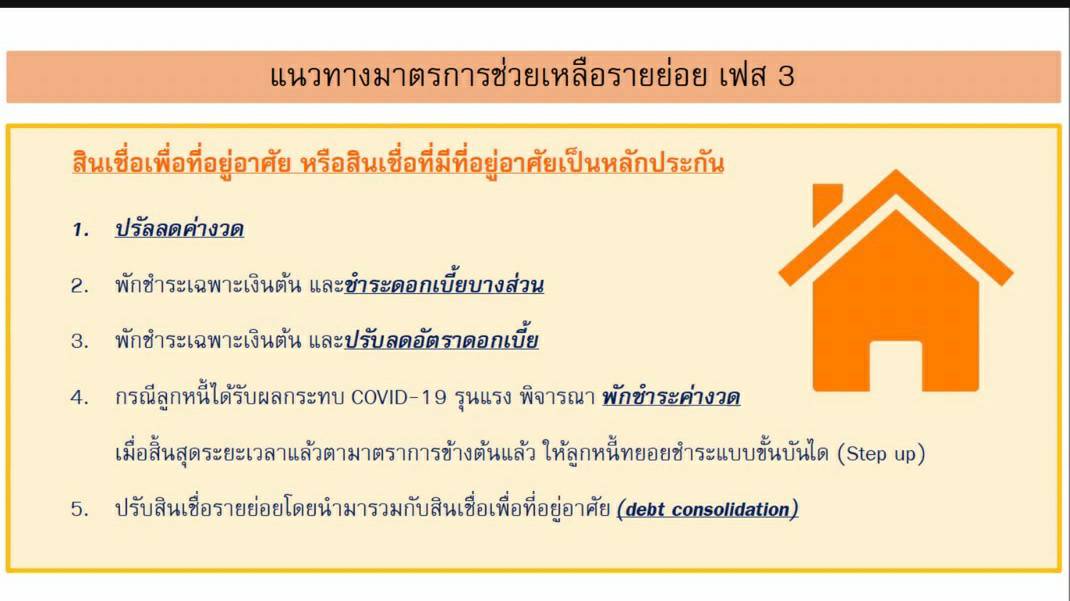 ดังนั้น ธนาคารจึงได้มี มาตรการช่วยเหลือลูกหนี้ที่ค้างชำระไม่เกิน 90 วัน เป็นการพักชำระเงินต้น และจ่ายเฉพาะดอกเบี้ย 25%-100% หรือ พักชำระเงินต้นและดอกเบี้ย ถึง ธันวาคม 2564 และมาตรการรวมหนี้ (Debt Consolidation) เป็นการรวมภาระหนี้ สินเชื่อเพื่อที่อยู่อาศัยและสินเชื่อรายย่อยประเภทอื่น เช่น สินเชื่อธุรกิจบัตรเครดิต สินเชื่อบุคคล สินเชื่อพัฒนากลุ่มอาชีพ สินเชื่อฐานราก เป็นต้น เพื่อลดภาระดอกเบี้ย และแบ่งเบาภาระค่าใช้จ่ายแต่ละเดือนให้มีสภาพคล่องไว้ใช้ในยามฉุกเฉิน