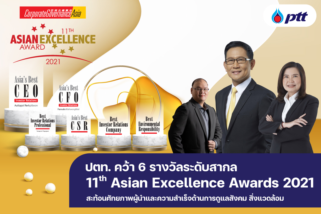 บริษัท ปตท. จำกัด (มหาชน) (ปตท.) ได้รับ 6 รางวัลความเป็นเลิศแห่งเอเชีย ประจำปี 2564 (11th Asian Excellence Award) ซึ่งเป็นรางวัลระดับสากลที่มอบให้กับบุคคลหรือองค์กรที่ดำเนินธุรกิจอย่างยั่งยืนและมีธรรมาภิบาล พร้อมดูแลรับผิดชอบชุมชน สังคม และสิ่งแวดล้อมในระดับดีเยี่ยม ประกอบด้วย รางวัลประเภทบุคคล ได้แก่ รางวัลซีอีโอยอดเยี่ยมแห่งเอเชีย (Asia’s Best CEO) มอบให้แก่ นายอรรถพล ฤกษ์พิบูลย์ ประธานเจ้าหน้าที่บริหารและกรรมการผู้จัดการใหญ่ รางวัลซีเอฟโอยอดเยี่ยมแห่งเอเชีย (Asia’s Best CFO) มอบให้แก่ นางสาวพรรณนลิน มหาวงศ์ธิกุล ประธานเจ้าหน้าที่บริหารการเงิน รางวัลนักลงทุนสัมพันธ์ยอดเยี่ยม (Best Investor Relations Professional) มอบให้แก่ นายธนพล ประภาพันธ์ ผู้จัดการฝ่ายผู้ลงทุนสัมพันธ์