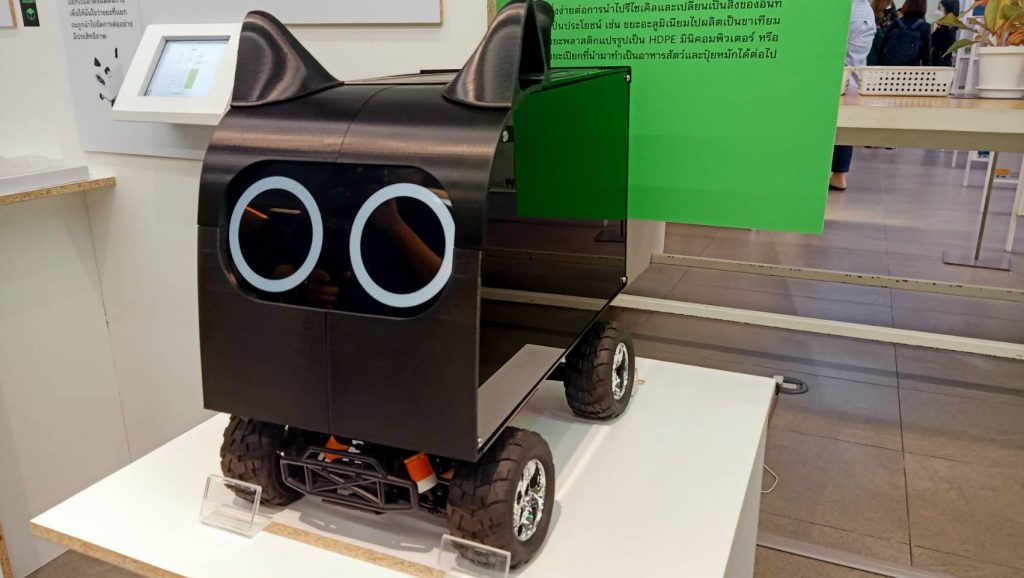 แพลตฟอร์ม บุญญ ที่จ.ขอนแก่น หุ่นยนต์แมวเก็บขยะที่สร้างแรงจูงใจและการมีส่วนร่วมของชุมชนในการคัดแยกด้วยการนำถังขยะมาคนให้ถังขยะมีบทบาทเป็นสื่อกลางให้ข้อมูลและความรู้เกี่ยวกับการคัดแยกขยะ
