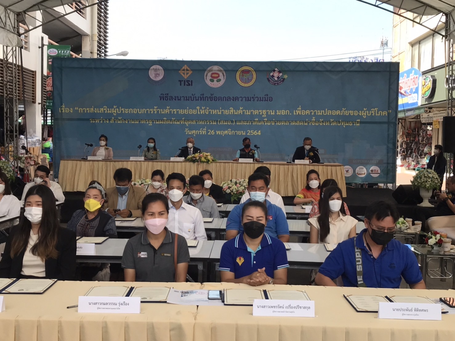 นายธีระยุทธ วานิชชัง ผู้ช่วยรัฐมนตรีประจำกระทรวงอุตสาหกรรม เป็นประธานในพิธีลงนามบันทึกข้อตกลงความร่วมมือเรื่อง”การส่งเสริมผู้ประกอบการร้านค้ารายย่อยให้จำหน่ายสินค้ามาตรฐาน มอก.เพื่อความปลอดภัยของผู้บริโภค”ระหว่างสำนักงานมาตรฐานผลิตภัณฑ์อุตสาหกรรม(สมอ.)กับภาคีเครือข่ายตลาดสดน่าซื้อปทุมธานี 33 แห่ง เช่นตลาดรังสิต ตลาดดีดีมาร์เช่ ตลาดสี่มุมเมือง ตลาดกลางลาดสวาย ตลาดเจริญผล ตลาดเพชรปทุม เป็นต้น