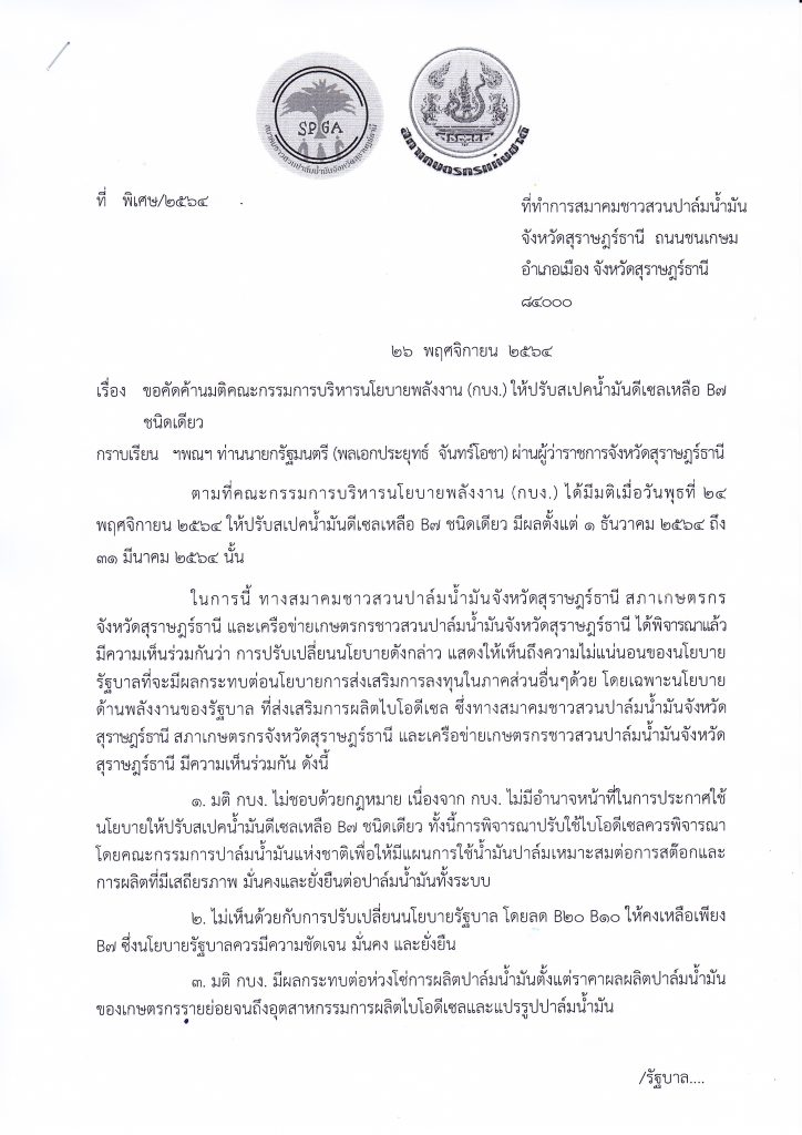 นายอธิราษฎร์ ดำดี คณะทำงานปาล์มน้ำมัน สภาเกษตรกรจังหวัดกระบี่กล่าวว่า ได้ประชุมร่วมกับนายกสมาคมชาวสวนปาล์มน้ำมันจังหวัดสุราษฎร์ธานีและชุมพร ประธานปาล์มน้ำมันแปลงใหญ่จังหวัดสุราษฎร์ธานี ประธาน ประธานสภาเกษตรกรจังหวัดสุราษฎร์ธานี กระบี่ นครศรีธรรมราชที่ที่ทำการสมาคมชาวสวนปาล์มน้ำมันจังหวัดสุราษฎร์ธานี จากนั้นทำหนังสือถึงพลเอกประยุทธ์ จันทร์โอชา นายกรัฐมนตรีและรัฐมนตรีว่าการกระทรวงกลาโหม โดยยื่นผ่านผู้ว่าราชการจังหวัดสุราษฎร์ธานี เรื่อง ขอคัดค้านมติคณะกรรมการบริหารนโยบายพลังงาน (กบง.) ที่ให้ปรับสเปคน้ำมันดีเซลเหลือ B7 ชนิดเดียว มีผลตั้งแต่ 1 ธันวาคม 2564 ถึง 31 มีนาคม 2565