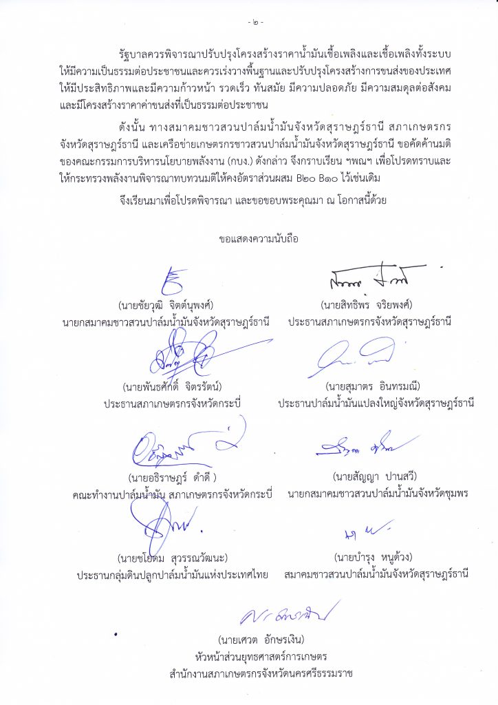 สุราษฎร์ธานี 26 พ.ย. – ผู้แทนชาวสวนปาล์มและสภาเกษตรกรหลายจังหวัดภาคใต้ทำหนังสือถึงนายกรัฐมนตรีเพื่อคัดค้านมติ กบง. ที่ปรับสูตรน้ำมันดีเซล เหลือ B7 สูตรเดียว โดยระบุว่าเป็นมติที่ไม่ชอบด้วยกฎหมาย