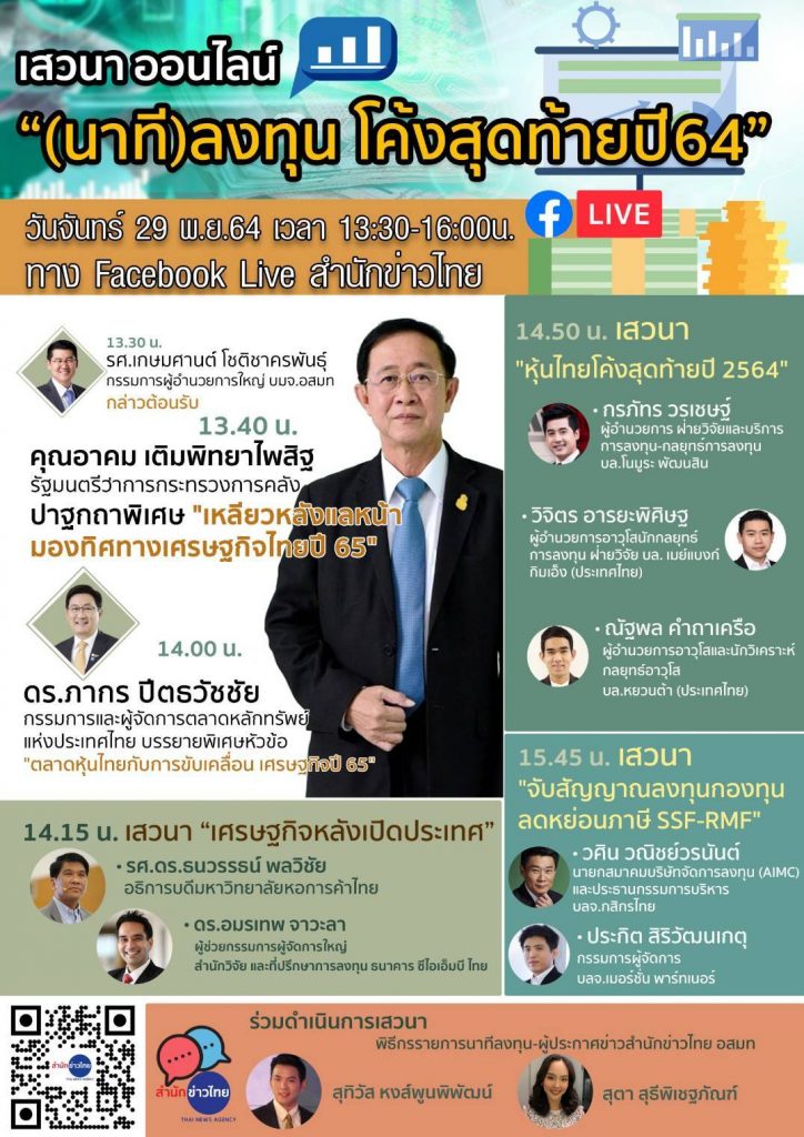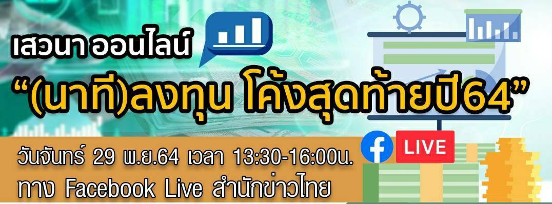 เสวนาออนไลน์“ (นาที) ลงทุนโค้งสุดท้ายปี 64” จันทร์ที่ 29 พ.ย.64 เวลา 13:30-16:00น ทาง FB Live สำนักข่าวไทย