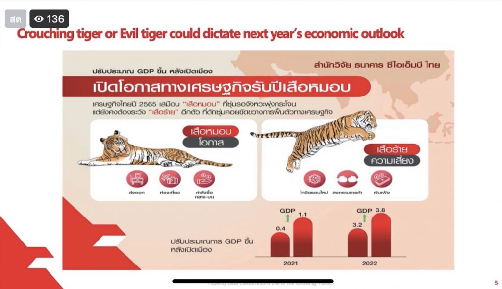 นายอมรเทพ จาวะลา ผู้ช่วยกรรมการผู้จัดการใหญ่ สำนักวิจัย และที่ปรึกษาการลงทุน ธ.ซีไอเอ็มบีไทย กล่าวว่า เศรษฐกิจโลก ยังช่วยส่งเสริมการส่งออกไทยให้ขยายตัวมากกว่าร้อยละ 10 นับว่าช่วยให้ภาคอุตสหกรรมส่งออก เริ่มดีขึ้น แม้ต้องเผชิญกับปัญหาโอไมครอน แต่มองว่าไม่เหมือนกับปัญหาล็อคดาวน์ในครั้งที่ผานมา จึงมองว่า ไม่กระทบต่อเศรษฐกิจไทยในไตรมาสแรกปี 65 ให้ย่ำแย่มากนัก สิ่งสำคัญในการฟื้นเศรษฐกิจไทย ต้องทำให้กระจายตัวไปยังเศรษฐกิจชุมชน เพราะที่ผ่านมาคนระดับกลางใช้จ่ายกระตุ้นเศรษฐกิจ ต้องหันมาให้รายย่อยมีกำลังซื้อ เพื่อลดปัญหาความเหลื่อมล้ำ