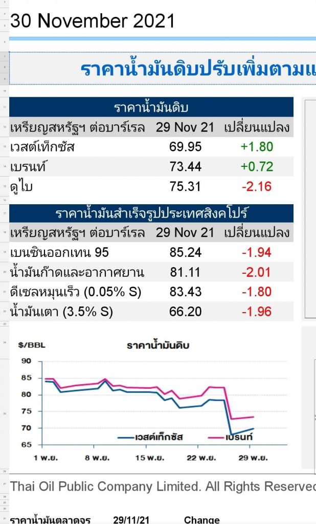 ส่วนความเคลื่อนไหวราคาน้ำมันดิบปิด 29 พ.ย.สัญญาน้ำมันดิบ ส่งมอบเดือน ม.ค. เพิ่มขึ้น 1.80 ดอลลาร์ ปิดที่ 69.95 ดอลลาร์/บาร์เรล, เบรนท์ (BRENT) ส่งมอบเดือนม.ค. เพิ่มขึ้น 72 เซนต์ ปิดที่ 73.44 ดอลลาร์/บาร์เรล.ส่วราคาน้ำมันดิบดูไบที่ไทยใช้อ้างอิงราคาและใช้เป็นฐานคำนวณเศรษฐกิจแม้ราคาปิดลดลงกว่า2ดอลลาร์ปิดที่75.31ดอลลาร์/บาร์เรลแต่ก็เป็นระดับราคาที่สูงกว่าตลาดยุโรป.. สะท้อนการฟื้นตัวของความต้องการใช้ที่เพิ่มขึ้นของภูมิภาคเอเชียโดยเฉพาะอินเดียที่มีความต้องการดีเซลเพิ่มขึ้นมาก