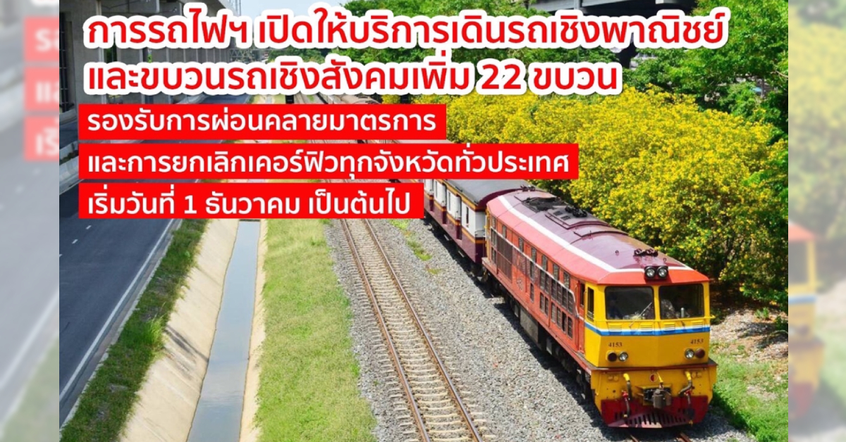 กรุงเทพฯ 30 พ.ย. – การรถไฟฯ เปิดให้บริการเดินรถเชิงพาณิชย์และขบวนรถเชิงสังคมเพิ่ม 22 ขบวน รองรับการผ่อนคลายมาตรการและการยกเลิกเคอร์ฟิวทุกจังหวัดทั่วประเทศ เริ่มวันพรุ่งนี้ (1 ธ.ค.)