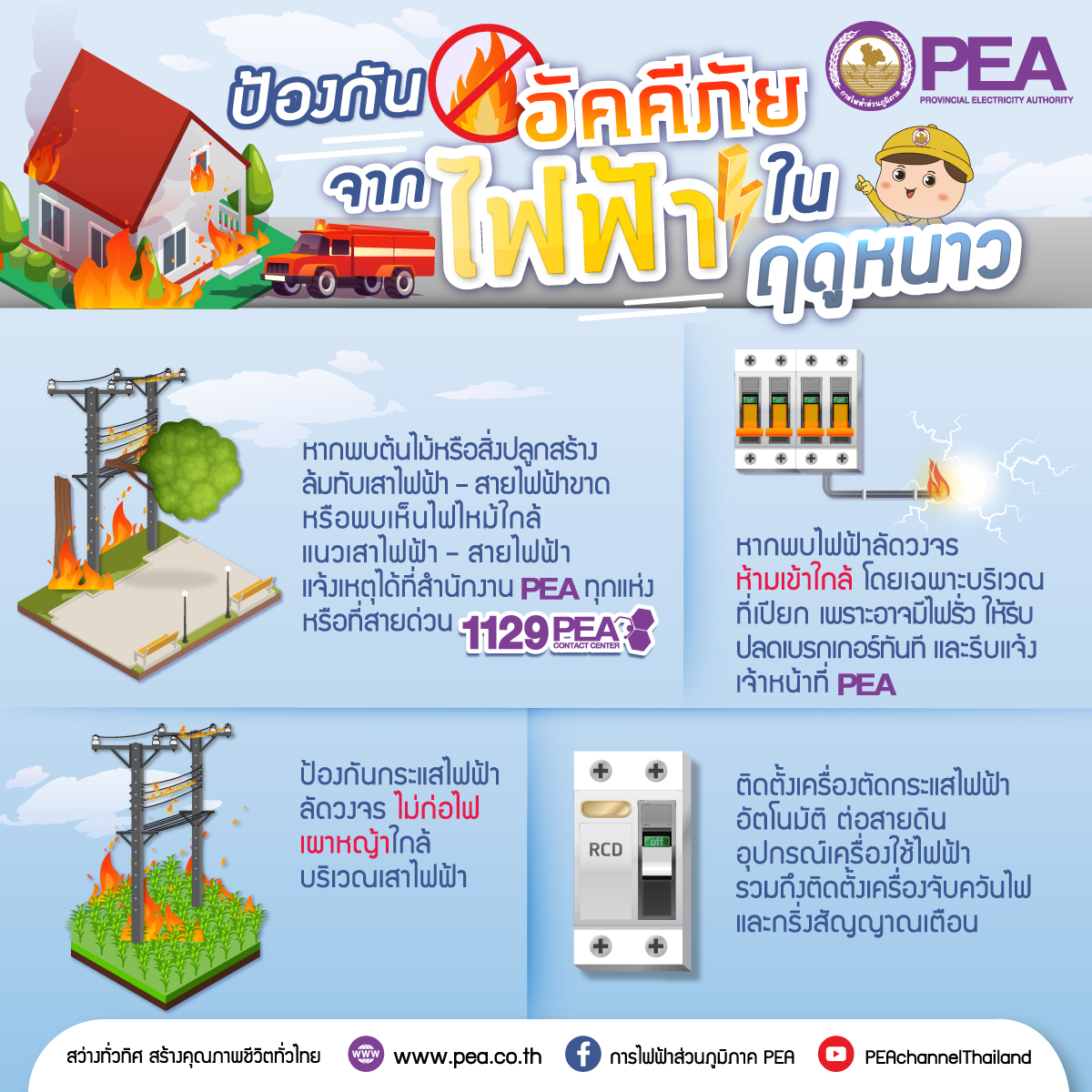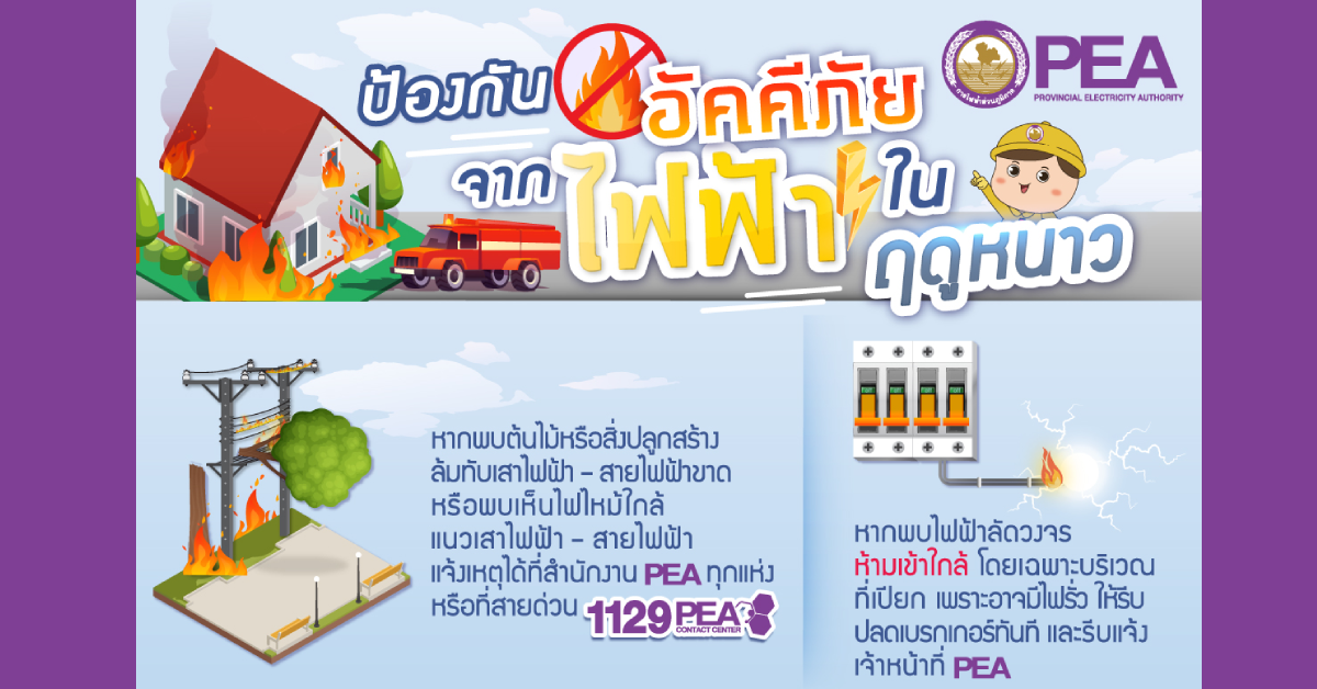 การไฟฟ้าส่วนภูมิภาค (PEA) เตือนภัยในช่วงฤดูหนาวซึ่งมีสภาพอากาศแห้งแล้ง ประกอบกับมีลมกระโชกแรง สภาพดังกล่าวอาจก่อให้เกิดไฟป่า ไฟไหม้หรือมีลมพัดแรงต้นไม้ล้มทับเสา – สายไฟ สิ่งปลูกสร้าง สร้างความเสียหายแก่ทรัพย์สินและอาจเป็นอันตรายถึงแก่ชีวิตได้ ดังนั้นเพื่อความปลอดภัยของประชาชนทุกพื้นที่ทั่วประเทศ