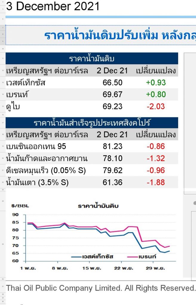 บมจ. ไทยออยล์ รายงานว่า ราคาน้ำมันดิบปรับตัวเพิ่มขึ้นเมื่อวานนี้ ( 2 ธ.ค.) หลังการประชุมของกลุ่มโอเปกและพันธมิตร (OPEC+) ในวันที่ 2 ธ.ค. 64 มีมติให้เพิ่มกำลังการผลิตตามแผนเดิม ที่ 400,000 บาร์เรลต่อวัน ในเดือน ม.ค. 65 เนื่องจากทางกลุ่มยังไม่กังวลกับการแพร่ระบาดของไวรัสโควิด-19 สายพันธุ์โอมิครอน อย่างไรก็ตาม ปัจจุบันกลุ่มโอเปกพลัสยังไม่สามารถเพิ่มกำลังการผลิตได้ตามเป้าหมายรายเดือน เนื่องจากสมาชิกหลายรายยังคงขาดการลงทุน ในขณะที่สหรัฐฯ แสดงท่าทีพอใจกับการตัดสินใจของกลุ่มโอเปก พลัส แต่ระบุว่าสหรัฐฯ ไม่มีแผนที่จะทบทวนการตัดสินใจระบายน้ำมันออกจากคลังสำรองทางยุทธศาสตร์ (SPR) 32 ล้านบาร์เรล ที่จะส่งมอบระหว่างปลายเดือน ธ.ค. ถึง เม.ย. 65 และจะผลักดันให้ประเทศอื่นๆ ทำเช่นเดียวกัน