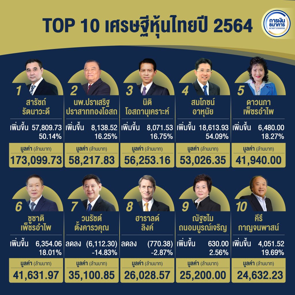 วารสารการเงินธนาคาร ร่วมกับคณะพาณิชยศาสตร์และการบัญชี จุฬาลงกรณ์มหาวิทยาลัย ร่วมจัดอันดับเศรษฐีหุ้นไทย โดยแชมป์เศรษฐีหุ้นไทยปี 2564 ยังคงเป็นของ สารัชถ์ รัตนาวะดี กรรมการ รองประธานกรรมการ และประธานเจ้าหน้าที่บริหาร บมจ.กัลฟ์ เอ็นเนอร์จี ดีเวลลอปเมนท์ (GULF) ครองแชมป์ติดต่อกันเป็นปีที่ 3 โดยถือหุ้นมูลค่าสูงสุดรวม 1.73 แสนล้านบาท รวยเพิ่มขึ้น 57,809 ล้านบาท หรือร้อยละ 50.14 นายสารัชถ์เป็นผู้ถือหุ้นอันดับ 1 ของ GULF ในสัดส่วนร้อยละ 35.55 มูลค่าความมั่งคั่งของ นายสารัชถ์ เศรษฐีหุ้น 3 สมัย เพิ่มขึ้นอย่างต่อเนื่องตั้งแต่ปี 2562 เนื่องจากราคาหุ้นของ GULF ปรับตัวขึ้นอย่างต่อเนื่องนับตั้งแต่เข้าจดทะเบียนในตลาดหลักทรัพย์ฯ เมื่อปี 2560