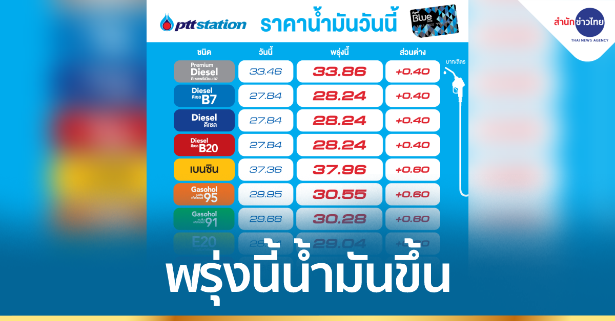 PTT Station ปรับราคาขายปลีกน้ำมันกลุ่มเบนซินและแก๊สโซฮอล์ทุกชนิดขึ้น 0.60 บาทต่อลิตร เว้น E85 ปรับขึ้น 0.40 บาทต่อลิตร ส่วนกลุ่มดีเซลทุกชนิด ปรับขึ้น 0.40 บาทต่อลิตร มีผล 10 ธ.ค.64 เวลา 05.00 น. เป็นต้นไป โดยราคาขายปลีก จะเป็นดังนี้ ULG = 37.96, GSH95 = 30.55, E20 = 29.04, GSH91 = 30.28, E85 = 23.39, HSD- B7= 28.24, HSD-B10 = 28.24, HSD-B20=28.24, ดีเซลพรีเมี่ยม B7 = 33.86 บาทต่อลิตร โดยราคาขายปลีกข้างต้นยังไม่รวมภาษีบำรุงกรุงเทพมหานคร.-สำนักข่าวไทย