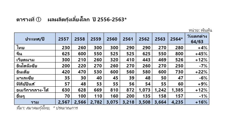 นายสมศักดิ์ ปณีตัธยาศัย นายกสมาคมกุ้งไทยเปิดเผยถึงสถานการณ์กุ้งของไทยปี 2564 ผ่านทางการประชุมออนไลน์ (Zoom Meeting) ว่า ผลผลิตกุ้งเลี้ยงปี 2564 โดยรวมอยู่ที่ 280,000 ตัน ส่วนปี 2563 อยู่ที่ 270,000 ตัน จึงเพิ่มขึ้นเล็กน้อย โดยคาดว่า ปี 2565 จะผลิตได้ 300,000 ตัน หรือเพิ่มขึ้นร้อยละ 4 ส่วนผลผลิตกุ้งทั่วโลกคาดว่า จะอยู่ที่ประมาณ 4.24 ล้านตัน เพิ่มขึ้นร้อยละ 16