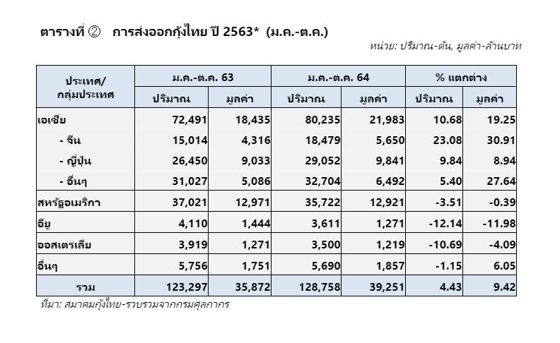 สำหรับผลผลิตกุ้งของไทยปีนี้ เป็นผลผลิตกุ้งจากภาคใต้ตอนล่าง ร้อยละ 33 จากภาคใต้ตอนบน ร้อยละ 32 จากภาคตะวันออก ร้อยละ 24 และ จากภาคกลาง ร้อยละ 11 ส่วนการส่งออกกุ้งเดือน ม.ค. – ต.ค. ปีนี้ ปริมาณ 128,758 ตัน มูลค่า 39,251 ล้านบาท เมื่อเทียบกับช่วงเวลาเดียวกันของปี 2563 ที่ส่งออกปริมาณ 123,297 ตัน มูลค่า 35,872 ล้านบาท เพิ่มขึ้นทั้งปริมาณ และมูลค่า ที่ร้อยละ 4 และ ร้อยละ 9 ตามลำดับ แม้ประสบปัญหาตู้คอนเทนเนอร์ขาดแคลน ค่าขนส่งราคาสูง และอื่นๆ