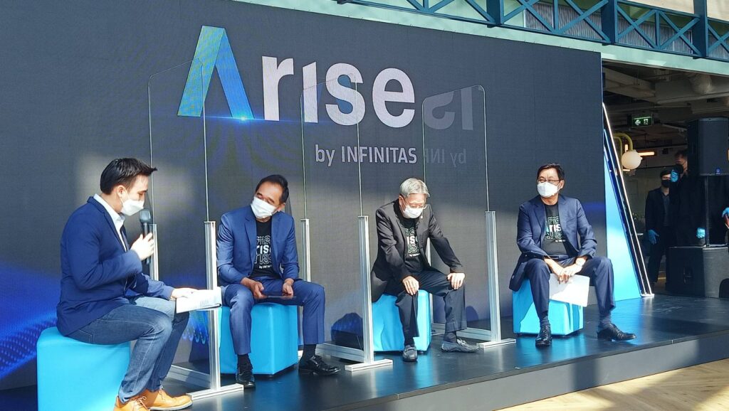 นายกฤษฎา จีนะวิจารณะ ประธานกรรมการธนาคารกรุงไทย พร้อมด้วยนายไกรฤทธิ์ อุชุกานนท์ชัย ประธานกรรมการ บริษัท อินฟินิธัส บาย กรุงไทย,นายผยง ศรีวณิช ผู้จัดการใหญ่ธนาคารกรุงไทย,นายภากร ปีตธวัชชัย กรรมการและผู้จัดการตลาดหลักทรัพย์แห่งประเทศไทย และ นายดิวียี วิทลานี่ กรรมการผู้จัดการใหญ่ประจำภูมิภาคเอเชียตะวันออกเฉียงใต้ บริษัท เอคเซนเซอร์ โซลูชั่น จำกัดร่วมกันแถลงข่าว การจัดตั้งบริษัทร่วมทุน “Arise by Infinitas” เพื่อเป็นศูนย์กลางพัฒนาบุคลากรด้านเทคโนโลยีที่มีความเชี่ยวชาญในสาขาต่างๆ รองรับการขยายธุรกิจของธนาคาร อินฟินิธัส และพันธมิตรทั้งในและต่างประเทศ
