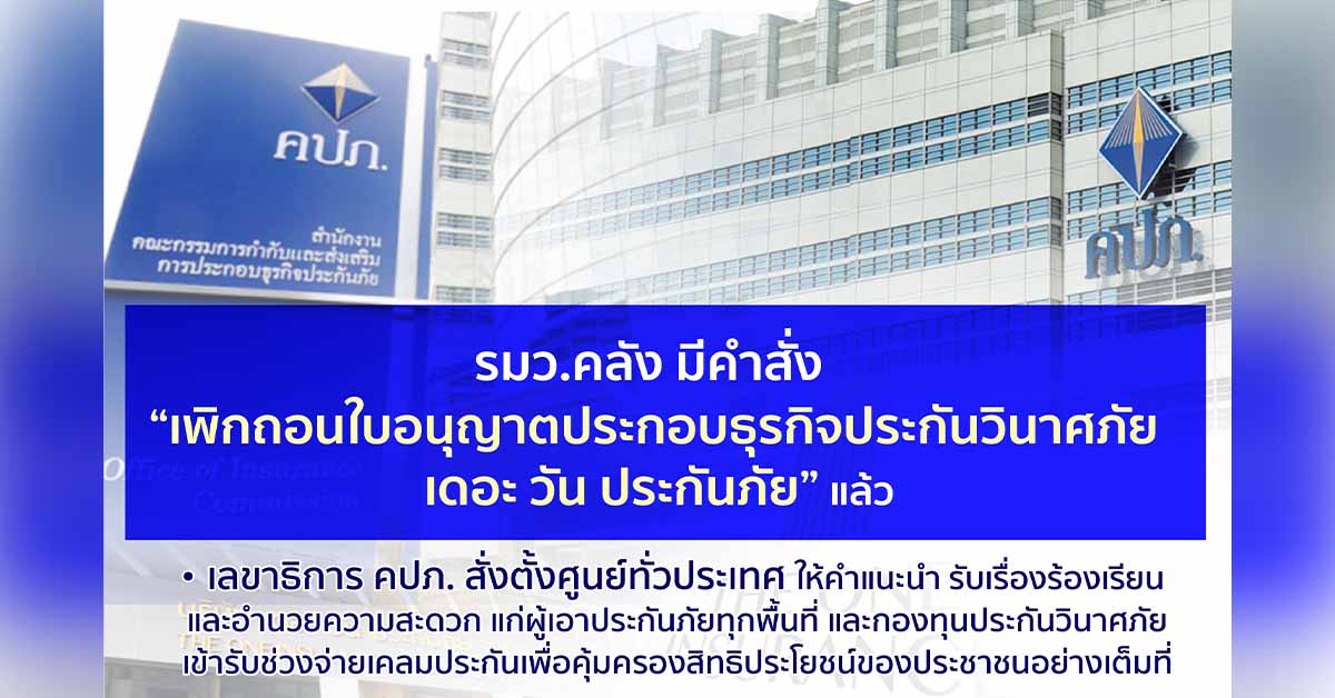 กทม. 13 ธ.ค.- รมว.คลัง มีคำสั่ง “เพิกถอนใบอนุญาตประกอบธุรกิจประกันวินาศภัย เดอะ วัน ประกันภัย” เลขาธิการ คปภ. สั่งตั้งศูนย์ทั่วประเทศให้คำแนะนำ รับเรื่องร้องเรียน อำนวยความสะดวกแก่ผู้เอาประกันภัยทุกพื้นที่ และกองทุนประกันวินาศภัยเข้ารับช่วงจ่ายเคลมประกันเพื่อคุ้มครองสิทธิประโยชน์ของประชาชนอย่างเต็มที่