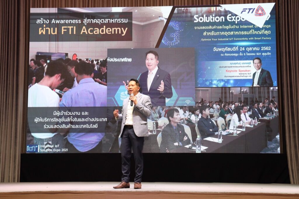 นายสุพันธุ์ มงคลสุธี ประธานสภาอุตสาหกรรมแห่งประเทศไทย (ส.อ.ท.) กล่าวเปิดงานและปาฐกถาพิเศษในหัวข้อ “พลิกฟื้นภาคอุตสาหกรรมด้วย Industrial IoT” ในช่วงหนึ่งว่า ปัจจุบันดิจิทัลดิสรัปชันและโควิด-19 ต่างเป็นตัวเร่งให้เกิดการเปลี่ยนแปลงด้านเทคโนโลยีที่รวดเร็วขึ้น ทุกธุรกิจและทุกอุตสาหกรรมจำเป็นต้องปรับตัวและเรียนรู้ให้เท่าทันกับเทคโนโลยีใหม่ๆ อาทิ Internet of Things (IoT), Metaverse, Artificial Intelligence (AI), Virtual Reality (VR), Automation & Robotics, Cloud, 5G, Big Data, Block Chain, Augmented Reality และ Cyber Security โดย Metaverse จะเข้ามามีบทบาทในทุกภาคส่วนและจะเกิด “Wave Digital Disruption รอบใหม่ขึ้น ส.อ.ท. จึงมุ่งขับเคลื่อนและสนับสนุนนโยบายส่งเสริมเทคโนโลยี IoT สู่อุตสาหกรรมไทยเพื่อยกระดับ Industry 4.0 ในภาคอุตสาหกรรม พร้อมสนับสนุน Industry Transformation เข้าสู่ Industry 4.0 สร้าง Awareness สู่ภาคอุตสาหกรรม ส่งเสริมให้เกิด Success Case การใช้ IoT ไปสู่สมาชิก ผ่านการดำเนินงานของสถาบันต่างๆ อาทิ สถาบันเทคโนโลยีสารสนเทศและการสื่อสารเพื่ออุตสาหกรรม (ICTI), FTI Academy, สถาบันรหัสสากล (GS1 Thailand) และสถาบันนวัตกรรมเพื่ออุตสาหกรรม พร้อมผลักดันผู้ประกอบการนำร่องให้เกิดการใช้งานแพลตฟอร์ม หวังว่าผู้เข้าร่วมงานสัมมนาจะได้รับองค์ความรู้จากวิทยากรภายในงานอย่างเต็มที่เพื่อนำกลับไปประยุกต์ใช้ในธุรกิจหรืออุตสาหกรรมต่อไป