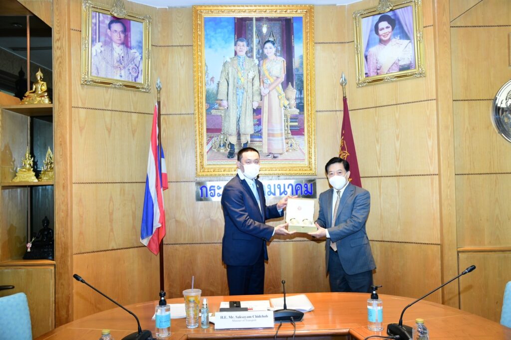 นายศักดิ์สยาม ชิดชอบ รัฐมนตรีว่าการกระทรวงคมนาคม ให้ นายหาน จื้อเฉียง (H.E. Mr. Han Zhiqiang) เอกอัครราชทูตสาธารณรัฐประชาชนจีนประจำประเทศไทยและคณะฯ เข้าเยี่ยมคารวะพร้อมแนะนำตัวในโอกาสเข้ารับหน้าที่เอกอัครราชทูตวิสามัญผู้มีอำนาจเต็มประจำประเทศไทย พร้อมทั้งหารือเกี่ยวกับความร่วมมือด้านการคมนาคมขนส่งระหว่างประเทศไทยและสาธารณรัฐประชาชนจีน โดยมี นายชยธรรม์ พรหมศร ปลัดกระทรวงคมนาคม ผู้แทนจากกรมการขนส่งทางราง สำนักงานนโยบายและแผนการขนส่งและจราจร และการรถไฟแห่งประเทศไทย เข้าร่วมหารือ