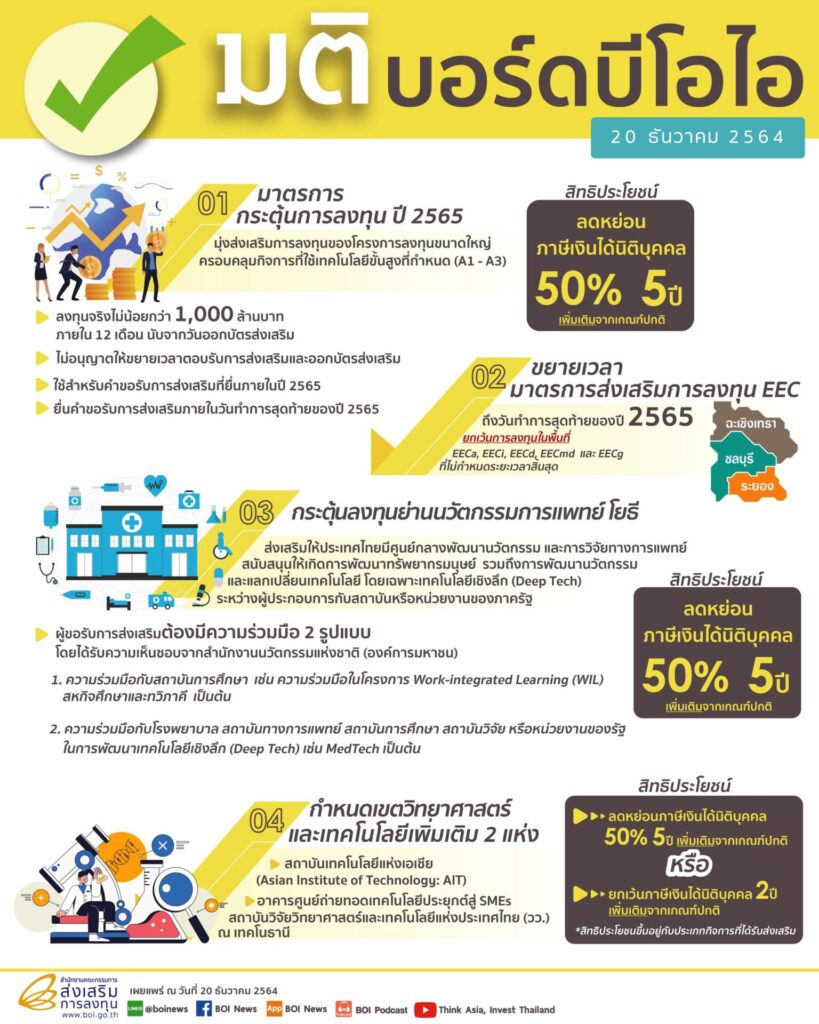 นางสาวดวงใจ อัศวจินตจิตร์ เลขาธิการคณะกรรมการส่งเสริมการลงทุน (บีโอไอ) เปิดเผยภายหลังการประชุมคณะกรรมการส่งเสริมการลงทุน หรือ บอร์ดบีโอไอ โดยมี พล.อ.ประยุทธ์ จันทร์โอชา นายกรัฐมนตรี เป็นประธาน ว่า ที่ประชุมได้พิจารณาเห็นชอบให้การส่งเสริมโครงการขนาดใหญ่ รวมมูลค่าการลงทุนกว่า 26,000 ล้านบาท เพื่อสร้างความพร้อมด้านพลังงาน พร้อมยกระดับขีดความสามารถการแข่งขันของไทยสู่การเป็นศูนย์กลางโลจิสติกส์และอุตสาหกรรมยานยนต์ไฟฟ้าในภูมิภาค เช่น
