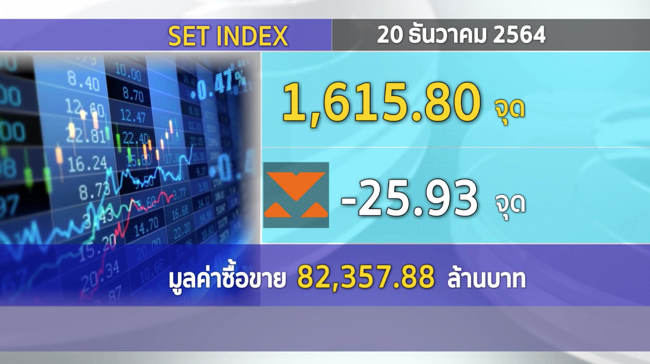 กทม. 20 ธ.ค.-ตลาดหลักทรัพย์ ปิดวันนี้ที่ระดับ 1,615.80 จุด ลดลง 25.93 จุด (-1.58%) มูลค่าการซื้อขาย 82,357.88 ล้านบาท หุ้นไทยวันนี้ปรับตัวลงตามตลาดต่างประเทศ รับ Sentiment เชิงลบจากสถานการณ์โควิดสายพันธุ์โอไมครอน ระบาดในยุโรป