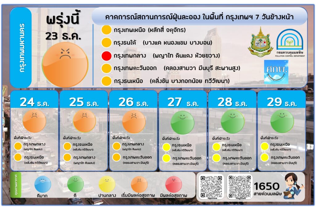ทั้งนี้แบบจำลองคุณภาพอากาศและภูมิศาสตร์สารสนเทศของกรมควบคุมมลพิษคาดการณ์ว่า วันพรุ่งนี้ สถานการณ์ฝุ่นละออง PM2.5 ในพื้นที่กรุงเทพและปริมณฑลจะยังคงอยู่ในเกณฑ์เริ่มมีผลกระทบต่อสุขภาพต่อเนื่องถึงวันที่ 26 ธันวาคม เนื่องจากสภาพอากาศที่ปิด/นิ่ง และสภาวะลมอ่อน จากนั้นระดับฝุ่นละอองจะลดลงบ้างในวันที่ 27-29 ธันวาคม เนื่องจากสภาพอากาศที่เปิดมากขึ้น ประกอบกับลมตะวันออกเฉียงเหนือที่มีกำลังแรงขึ้นพัดช่วย โดยประชาชนสามารถติดตามสถานการณ์ผ่านทางเว็บไซต์ Air4Thai.com และ bangkokairquality.com แอปพลิเคชัน Air4Thai และ AirBKK.- สำนักข่าวไทย