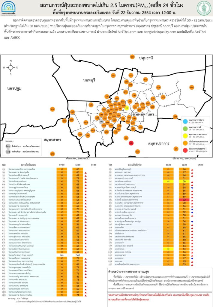 นายอรรถพล เจริญชันษา อธิบดีกรมควบคุมมลพิษกล่าวว่า ศูนย์แก้ไขปัญหามลพิษทางอากาศ (ศกพ.) รายงานการติดตามตรวจสอบคุณภาพอากาศวันนี้ (22 ธ.ค.) ซึ่งจากการตรวจวัดฝุ่น PM2.5 พบเกินค่ามาตรฐานในกรุงเทพฯ จังหวัดปทุมธานี นนทบุรี นครปฐม สมุทรสาคร สมุทรปราการ ลพบุรี สระบุรี จ.สุพรรณบุรี จ.พระนครศรีอยุธยา จ.ราชบุรี จ.สมุทรสงคราม จ.ปราจีนบุรี จ.ฉะเชิงเทรา จ.ชลบุรี ระยอง และนครราชสีมา