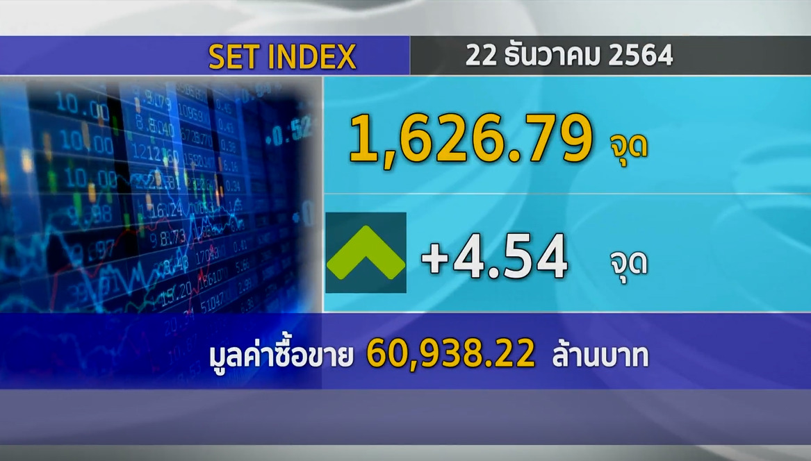 กทม. 22 ธ.ค.-ตลาดหลักทรัพย์ ปิดวันนี้ที่ระดับ 1,626.79 จุด เพิ่มขึ้น 4.54 จุด (+0.28%) มูลค่าการซื้อขาย 60,938.22 ล้านบาท หุ้นไทยวันนี้แกว่งไซด์เวย์ สอดคล้องภูมิภาค โดยมีปัจจัยหนุนจากมาตรการกระตุ้นเศรษฐกิจภาครัฐ และ กนง.ปรับเพิ่มคาดการณ์ GDP ปีนี้