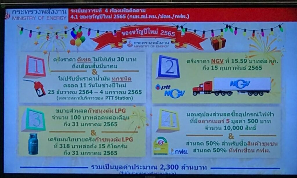 นายสุพัฒนพงษ์ พันธ์มีเชาว์ รองนายกรัฐมนตรีและรัฐมนตรีว่าการกระทรวงการคม เปิดเผยว่า กระทรวงพลังงาน และหน่วยงานในการกำกับดูแลได้มอบของขวัญปีใหม่ให้แก่ประชาชนทุกคนใช้ช่วงเทศกาลปีใหม่ ด้วยการตรึงราคาน้ำมันทุกชนิดตลอด 11 วัน ระหว่างวันที่ 25 ธันวาคม 2564-วันที่ 4 มกราคม 2565 (เฉพาะสถานีบริการของ PTT Station) ตรึงราคาน้ำมันดีเซลไม่เกิน 30 บาทต่อลิตรถึงสิ้นเดือนมีนาคม 2565 ขยายส่วนลด LPG จำนวน 100 บาทต่อคนต่อเดือนจนถึง 31 มกราคม 2565 ควบคู่ไปกับการตรึงราคา LPG อยู่ที่ 318 บาท/ถัง 15 กิโลกรัม จนถึง 31 มกราคม 2565 ตรึงราคา NGV อยู่ที่ 15.59 บาท/กก. จนถึง 15 กุมภาพันธ์ 2565 ขณะเดียวกัน ยังแจกคูปองส่วนลดอุปกรณ์ไฟฟ้าเบอร์ 5 มูลค่า 500 บาท จำนวน 10,000 สิทธิ์ และส่วนลด 50% สำหรับเลือกซื้อสินค้าชุมชน และที่พักบนเขื่อนของการไฟฟ้าฝ่ายผลิตแห่งประเทศไทย