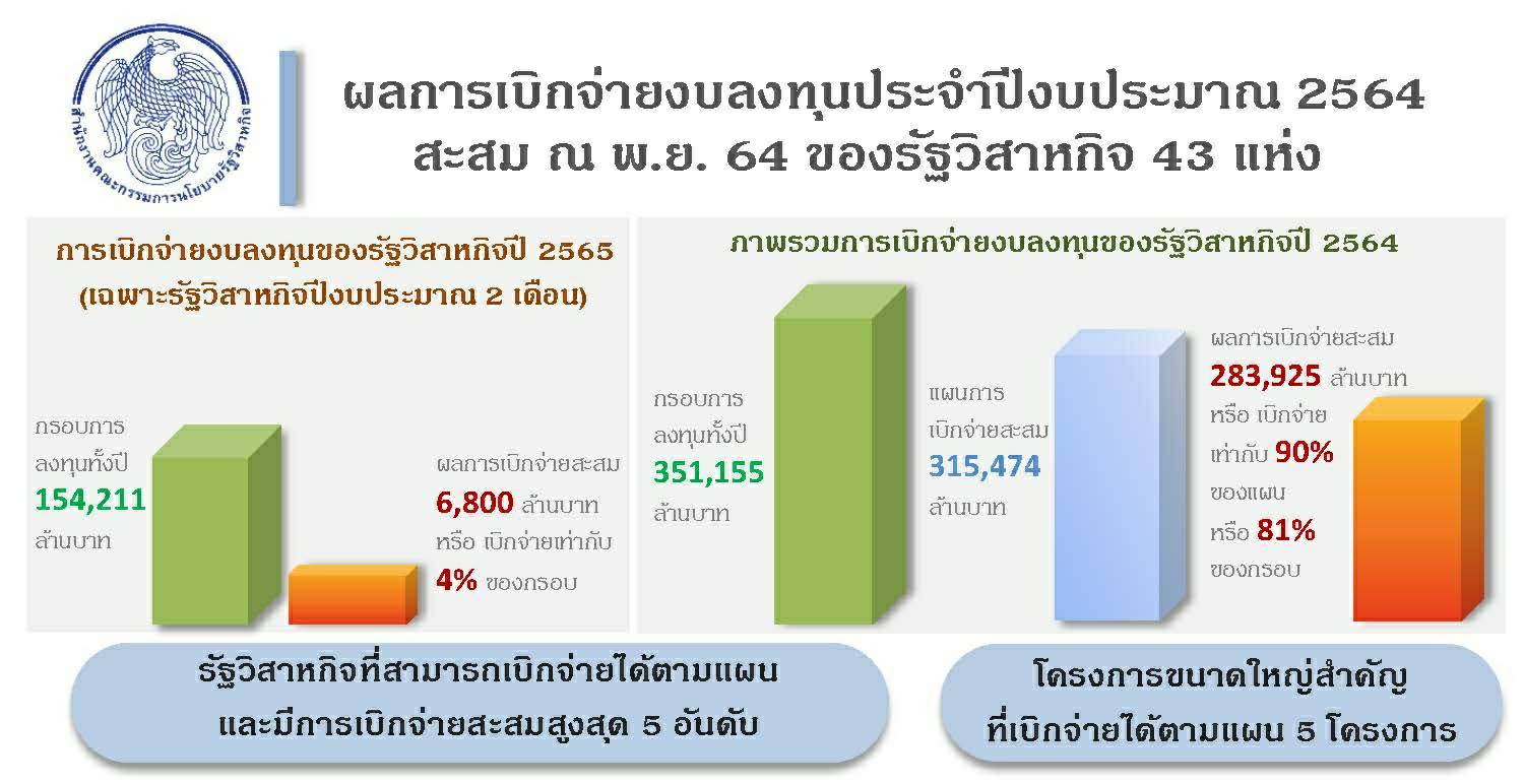 นางปานทิพย์ ศรีพิมล ผู้อำนวยการสำนักงานคณะกรรมการนโยบายรัฐวิสาหกิจ (สคร.) เปิดเผยว่า ผลการเบิกจ่ายงบลงทุนในปี 2564 ณ สิ้นเดือนพฤศจิกายน 64 โดยรัฐวิสาหกิจปีงบประมาณ ได้เริ่มการเบิกจ่ายงบลงทุนปีงบประมาณ 2565 มาแล้ว 2 เดือน (ตุลาคม –พฤศจิกายน 64) มีผลการเบิกจ่าย 6,800 ล้านบาท หรือร้อยละ 74 ของแผนการเบิกจ่ายสะสม ส่วนรัฐวิสาหกิจปีปฏิทิน 9 แห่ง มีผลการเบิกจ่ายสะสมตั้งแต่เดือนมกราคม – พฤศจิกายน 2564 จำนวน 138,460 ล้านบาท หรือคิดเป็นร้อยละ 98 ของแผนการเบิกจ่ายสะสม ทำให้ภาพรวมการเบิกจ่ายงบลงทุนของรัฐวิสาหกิจจำนวน 43 แห่งในปี 2564 เท่ากับ 283,925 ล้านบาท นับเป็นส่วนหนึ่งในการอัดฉีดเงินลงทุนออกสู่ระบบ แม้ว่าในปี 2564 รัฐวิสาหกิจ ต่าง ได้รับผลกระทบจาก Covid – 19 แต่ยังคงเบิกจ่ายงบลงทุนปี 2564 เป็นไปตามแผน และสูงกว่าช่วงเวลาเดียวกันของปีก่อน สคร. ยังกำชับให้รัฐวิสาหกิจเตรียมความพร้อมรับมือกับความเสี่ยงจากสถานการณ์ต่างๆ ที่อาจเกิดขึ้นในอนาคตด้วย.-สำนักข่าวไทย