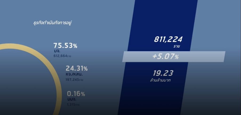 อย่างไรก็ตาม ส่งผลให้ยอดจดทะเบียนตั้งใหม่ทั่วประเทศในช่วง 11 เดือนของปี 64 ตั้งแต่เดือนมกราคม-พฤศจิกายน 64 มียอดทั้งสิ้น 69,253 ราย ขณะทีเลิกกิจการในช่วง 11 เดือนปีนีมีแค่ 13,617 รายส่งผลให้ธุรกิจดำเนินกิจการอยู่ ณ เดือนพฤศจิกายน 64 มีจำนวน 811,224 ราย มูลค่าทุน 19.23 ล้านล้านบาท จำแนกเป็นห้างหุ้นส่วนจำกัด/ห้างหุ้นส่วนสามัญนิติบุคคล จำนวน 197,245 ราย บริษัทจำกัด จำนวน 612,664 ราย และบริษัทมหาชนจำกัด จำนวน 1,315 ราย