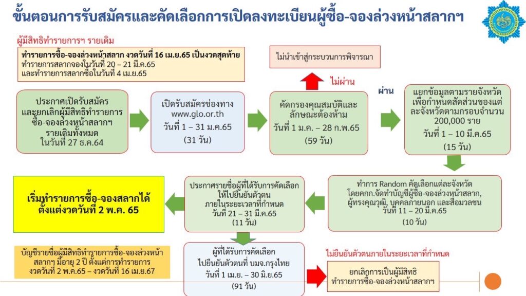 แนวทางที่สอง คือ การรื้อระบบ ซื้อ-จองล่วงหน้าเดิม เพื่อเปิดรับสมัครลงทะเบียนใหม่ทั้งหมด จำนวน 200,000 ราย รับสลาก 5 เล่ม/งวด เปิดให้สมัครผ่านเว็บไซต์ของสำนักงานสลากฯ เพื่อนำข้อมูลผู้สมัครมาคัดกรองคุณสมบัติ ห้ามข้าราชการ รัฐวิสาหกิจ พนักงานบริษัท เพราะเป็นผู้มีรายได้เงินเดือนประจำแล้ว จึงต้องการเปิดให้รายย่อยที่ต้องการขายสลาก เข้ามาลงทะเบียน โดยสามารถเช็คคุณสมบัติผ่านระบบข้อมูลได้ทั้งหมด หากมีผู้สมัครเกินจำนวนที่กำหนด จะใช้วิธีเรียงลำดับแบบสุ่มหรือ Random sort ทั้งส่วนกลางและรายจังหวัด เมื่อคัดกรองได้ทั้งหมด ตามรายชื่อผู้ลงทะเบียน จะเริ่ม จำหน่ายตั้งแต่สลากงวดวันที่ 2 พฤษภาคม 2565 เป็นต้นไป