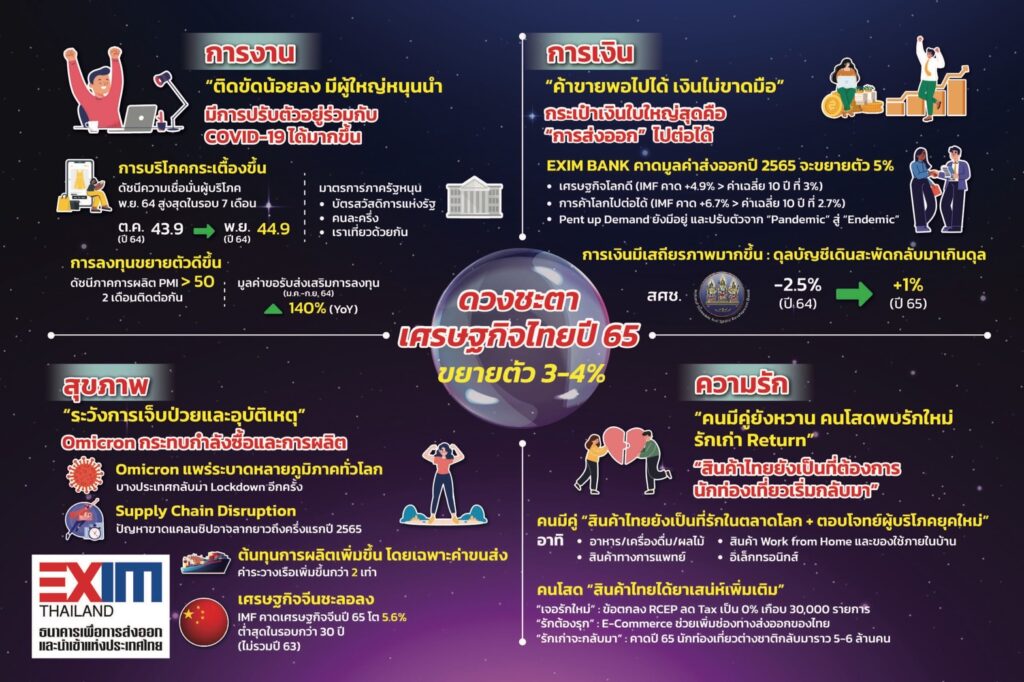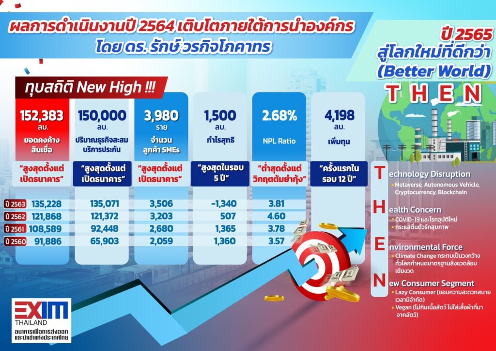 EXIM BANK ชี้ปี 2565 เศรษฐกิจไทยมีแนวโน้มขยายตัวตามเศรษฐกิจโลก ผู้ส่งออกต้องปรับตัวรับเทรนด์ใหม่ของโลกยุค Next Normal เน้นเศรษฐกิจเชื่อมโยงการพัฒนาเทคโนโลยี การดูแลสุขภาพ การปฏิบัติตามมาตรฐานสากลด้านสิ่งแวดล้อม และการตอบสนองความต้องการของลูกค้าแบบเจาะกลุ่ม หลัง EXIM BANK ฉลองความสำเร็จผลการดำเนินงานปี 2564 และ 9 เดือนภายใต้การบริหารงานของ ดร.รักษ์ วรกิจโภคาทร กรรมการผู้จัดการ คาดการณ์ยอดคงค้างสินเชื่อและปริมาณธุรกิจสะสมบริการประกันทะลุกว่า 150,000 ล้านบาท สูงสุดเป็นประวัติการณ์นับตั้งแต่เปิดดำเนินงาน สร้างกำไรสุทธิกว่า 1,500 ล้านบาท เติบโตทะยานขึ้นกว่า 200% จากปี 2563 และสูงสุดในรอบ 5 ปี