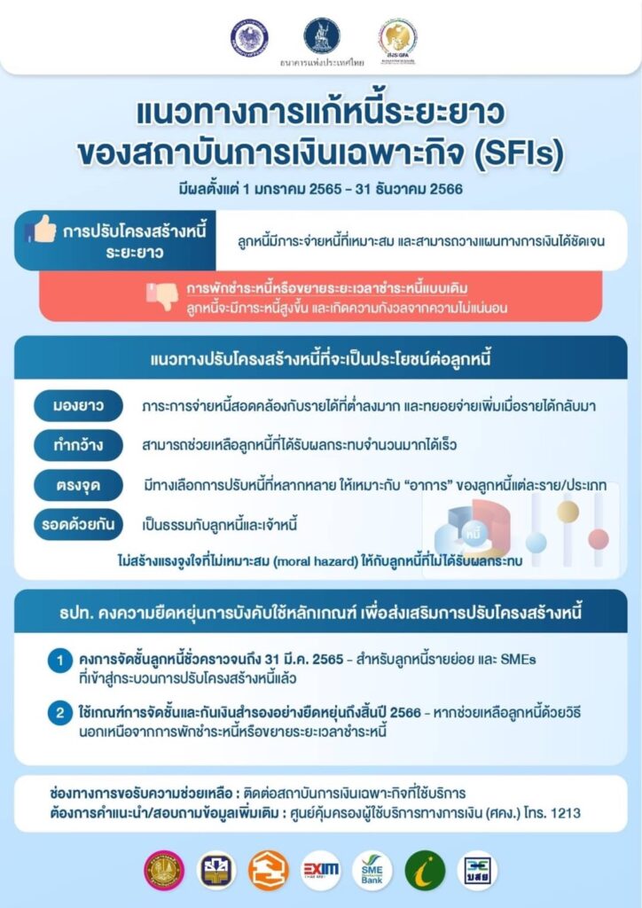 2. มาตรการสนับสนุนการปรับโครงสร้างหนี้ เพื่อให้ SFIs เร่งแก้ไขปัญหาหนี้เดิมด้วยการปรับโครงสร้างหนี้แบบระยะยาวอย่างตรงจุดและเหมาะสมกับปัญหาของลูกหนี้แต่ละราย โดยกำหนดงวดจ่ายชำระหนี้ให้สอดคล้องกับรายได้ที่ลดลงมากของลูกหนี้ และให้ลูกหนี้ทยอยจ่ายชำระหนี้เพิ่มขึ้นเมื่อรายได้เริ่มกลับมา รวมทั้งต้องเร่งช่วยลูกหนี้ให้ได้จำนวนมากและรวดเร็ว ซึ่ง ธปท. ได้ผ่อนคลายหลักเกณฑ์การจัดชั้นและการกันเงินสำรองตามความเข้มข้นของการให้ความช่วยเหลือ โดยมาตรการดังกล่าวจะมีผลบังคับใช้เป็นการชั่วคราวระหว่าง วันที่ 1 มกราคม 2565 – 31 ธันวาคม 2566 ซึ่งจะสอดคล้องกับมาตรการแก้หนี้ระยะยาว 3 กันยายน 2564 ของธนาคารพาณิชย์ที่ดำเนินการอยู่